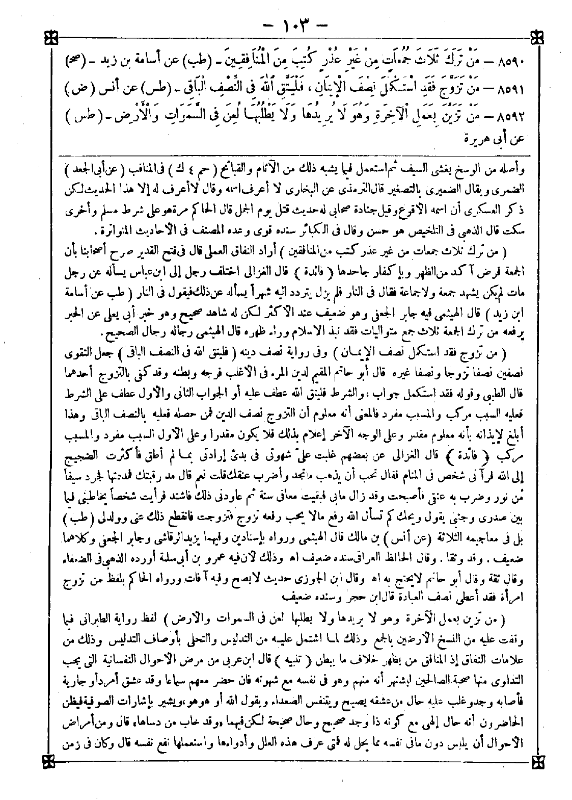 8590 - (من ترك ثلاث جمعات من غير عذر كتب من المنافقين) أراد النفاق العملي قال في فتح القدير: صرح أصحابنا بأن الجمعة فرض آكد من الظهر وبإكفار جاحدها