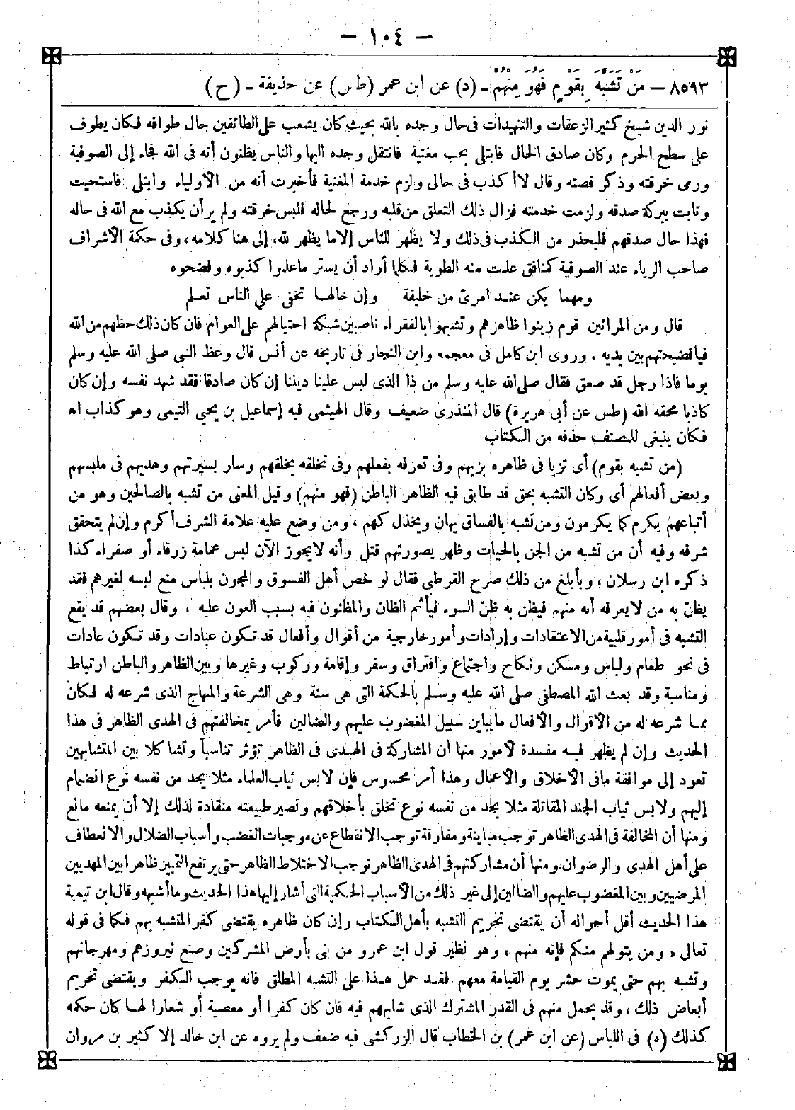 8593 - (من تشبه بقوم) أي تزيا في ظاهره بزيهم وفي تعرفه بفعلهم وفي تخلقه بخلقهم وسار بسيرتهم وهديهم في ملبسهم وبعض أفعالهم أي وكان التشبه بحق قد طابق فيه الظاهر الباطن (فهو منهم) وقيل المعنى من تشبه بالصالحين وهو من أتباعهم يكرم كما يكرمون ومن تشبه بالفساق يهان ويخذل كهم ومن وضع عليه علامة الشرف أكرم وإن لم يتحقق شرفه وفيه أن من تشبه من الجن بالحيات وظهر يصورتهم قتل وأنه لا يجوز الآن لبس عمامة زرقاء أو صفراء كذا ذكره ابن رسلان وبأبلغ من ذلك صرح القرطبي فقال: لو خص أهل الفسوق والمجون بلباس منع لبسه لغيرهم فقد يظن به من لا يعرفه أنه منهم فيظن به ظن السوء فيأثم الظان والمظنون فيه بسبب العون عليه وقال بعضهم: قد يقع التشبه في أمور قلبية من الاعتقادات وإرادات وأمور خارجية من أقوال وأفعال قد تكون عبادات وقد تكون عادات في نحو طعام ولباس ومسكن ونكاح واجتماع وافتراق وسفر وإقامة وركوب وغيرها وبين الظاهر والباطن ارتباط ومناسبة وقد بعث الله المصطفى صلى الله عليه وسلم بالحكمة التي هي سنة وهي الشرعة والمنهاج الذي شرعه له فكان مما شرعه له من الأقوال والأفعال ما يباين سبيل المغضوب عليهم والضالين فأمر بمخالفتهم في الهدى الظاهر في هذا الحديث وإن لم يظهر فيه مفسدة لأمور منها أن المشاركة في الهدى في الظاهر تؤثر تناسبا وتشاكلا بين المتشابهين تعود إلى موافقة ما في الأخلاق والأعمال وهذا أمر محسوس فإن لابس ثياب العلماء مثلا يجد من نفسه نوع انضمام إليهم ولابس ثياب الجند المقاتلة مثلا يجد من نفسه نوع تخلق بأخلاقهم وتصير طبيعته منقادة لذلك إلا أن يمنعه مانع ومنها أن المخالفة في الهدى الظاهر توجب مباينة ومفارقة توجب الانقطاع عن موجبات الغضب وأسباب الضلال والانعطاف على أهل الهدى والرضوان ومنها أن مشاركتهم في الهدى للظاهر توجب الاختلاط الظاهر حتى يرتفع التمييز ظاهرا بين المهدبين المرضيين وبين المغضوب عليهم والضالين الى غير ذلك من الأسباب الحكيمة التي أشار إليها هذا الحديث وما أشبهه. وقال ابن تيمية: هذا الحديث أقل أحواله أن يقتضي تحريم التشبه بأهل الكتاب وإن كان ظاهره يقتضي كفر المتشبه بهم فكما في قوله تعالى {ومن يتولهم منكم فإنه منهم} وهو نظير قول ابن عمرو من بنى بأرض المشركين وصنع نيروزهم ومهرجانهم وتشبه بهم حتى يموت حشر يوم القيامة معهم فقد حمل هذا على التشبه المطلق فإنه يوجب الكفر ويقتضي تحريم أبعاض ذلك وقد يحمل منهم في القدر المشترك الذي شابههم فيه فإن كان كفرا أو معصية أو شعارا لها كان حكمه كذلك