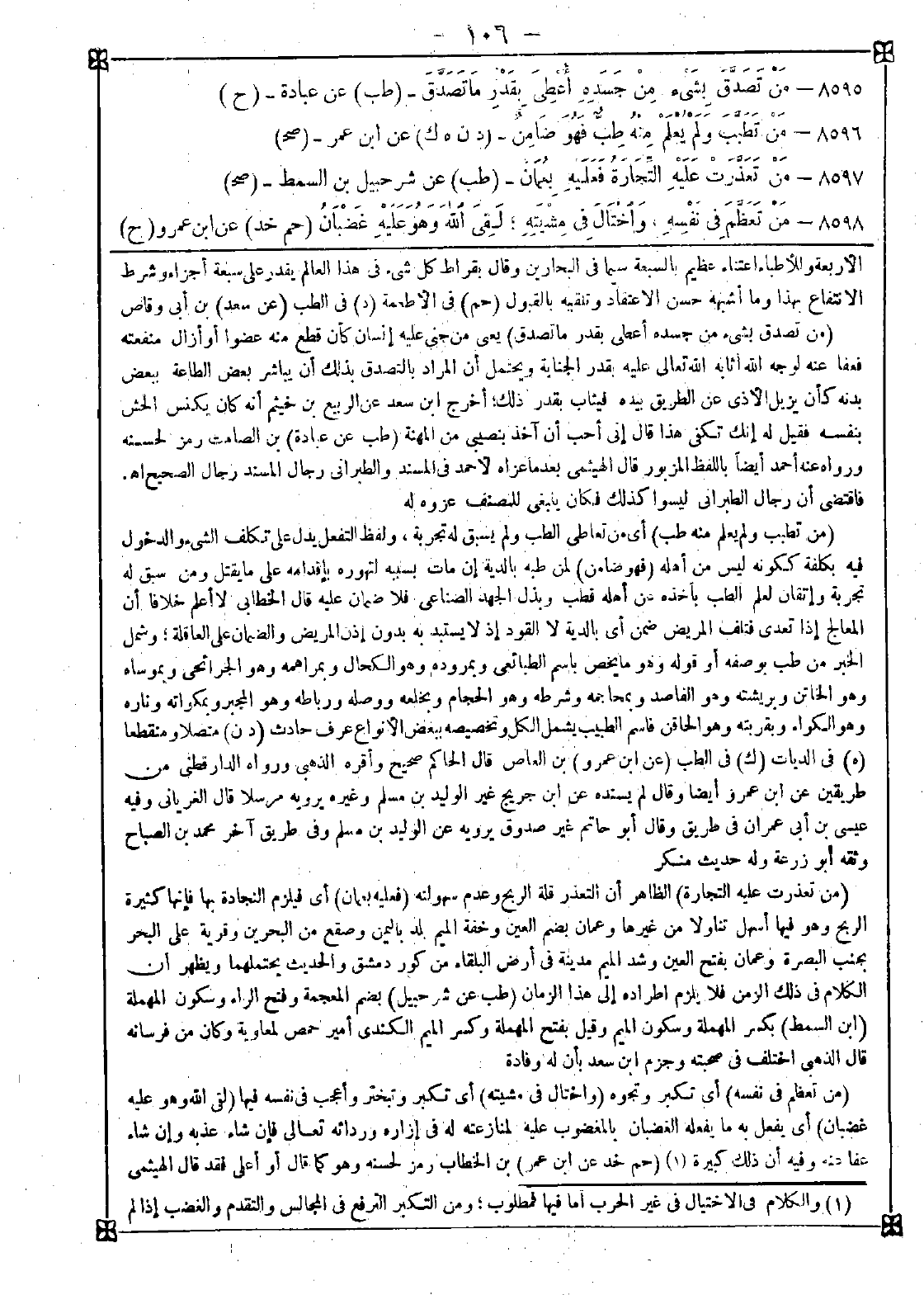 8596 - (من تطبب ولم يعلم منه طب) أي من تعاطى الطب ولم يسبق له تجربة ولفظ التفعل يدل على تكلف الشيء والدخول فيه بكلفة ككونه ليس من أهله (فهو ضامن) لمن طبه بالدية إن مات بسببه لتهوره بإقدامه على ما يقتل ومن سبق له تجربة وإتقان لعلم الطب بأخذه عن أهله فطب وبذل الجهد الصناعي فلا ضمان عليه قال الخطابي: لا أعلم خلافا أن المعالج إذا تعدى فتلف المريض ضمن أي بالدية لا القود إذ لا يستبد به بدون إذن المريض والضمان على العاقلة وشمل الخبر من طب بوصفه أو قوله وهو ما يخص باسم الطبائعي وبمروده وهو الكحال وبمراهمه وهو الجرائحي وبموساه وهو الخاتن وبريشته وهو الفاصد وبمحاجمه وشرطه وهو الحجام وبخلعه ووصله ورباطه وهو المجبر وبمكواته وناره وهو الكواء وبقربته وهو الحاقن فاسم الطبيب يشمل الكل وتخصيصه ببعض الأنواع عرف حادث