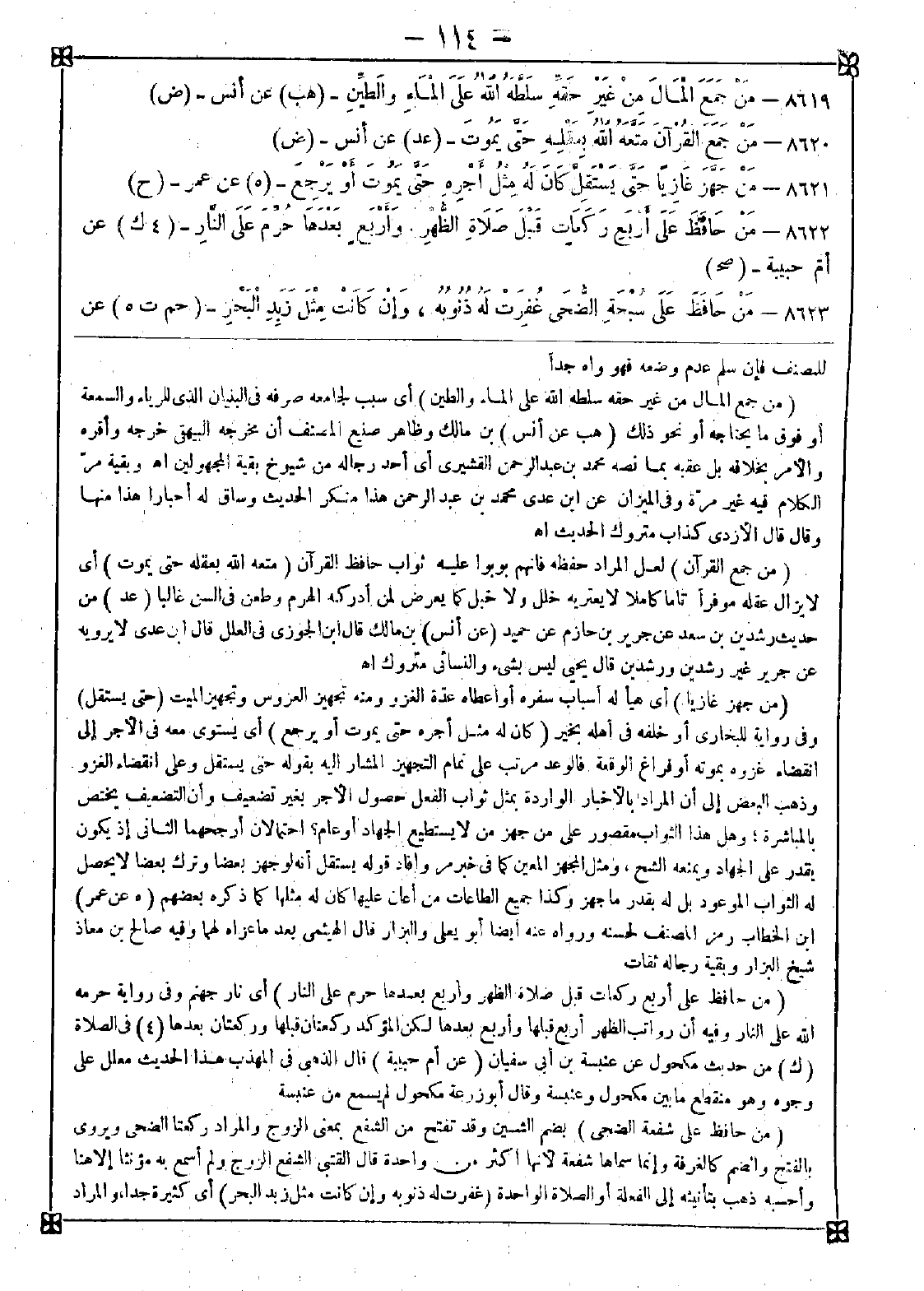 8622 - (من حافظ على أربع ركعات قبل صلاة الظهر وأربع بعدها حرم على النار) أي نار جهنم وفي رواية حرمه الله على النار وفيه أن رواتب الظهر أربع قبلها وأربع بعدها لكن المؤكد ركعتان قبلها وركعتان بعدها