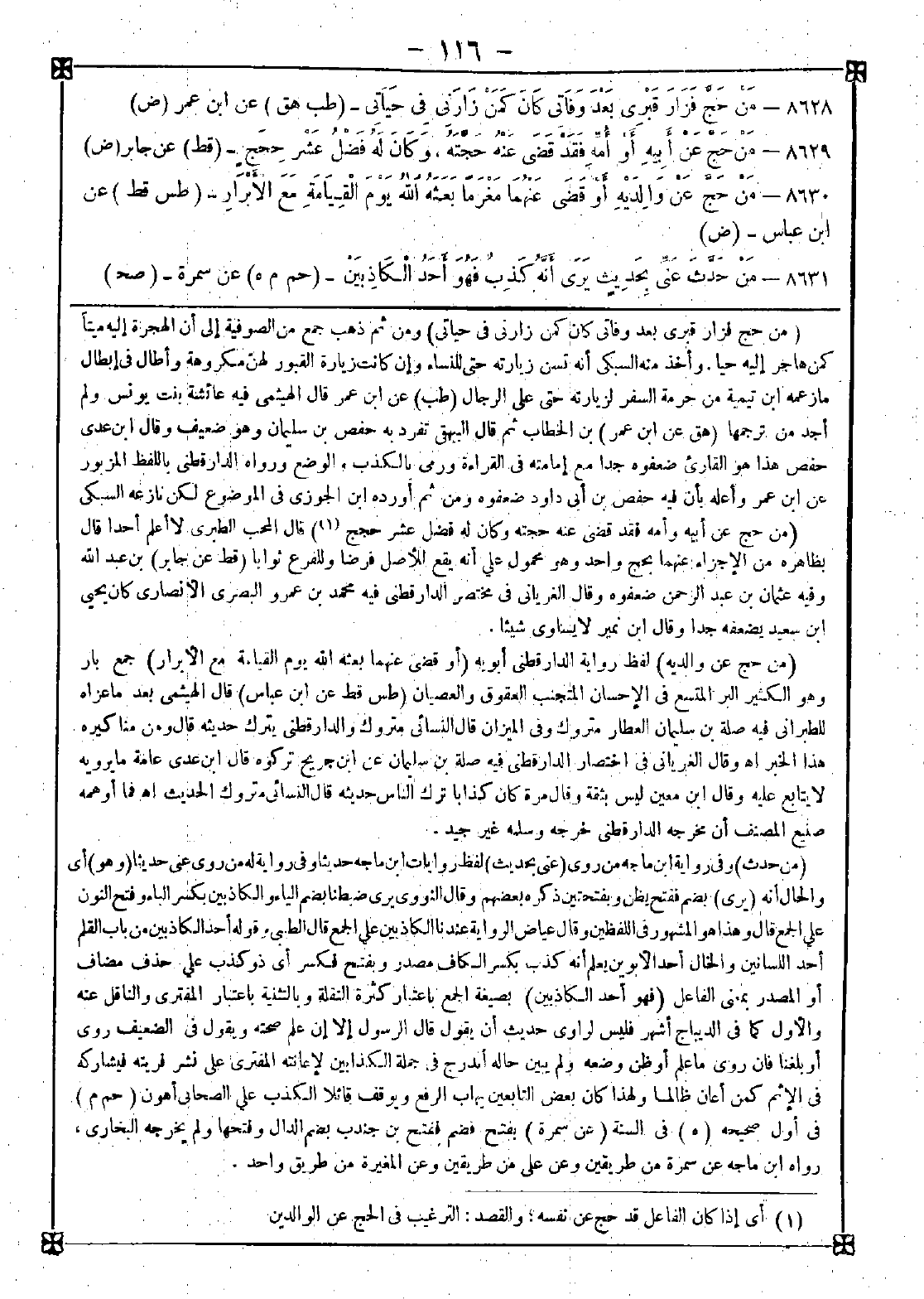 -[116]- 8628 - (من حج فزار قبري بعد وفاتي كان كمن زارني في حياتي) ومن ثم ذهب جمع من الصوفية إلى أن الهجرة إليه ميتا كمن هاجر إليه حيا. وأخذ منه السبكي أنه تسن زيارته حتى للنساء وإن كانت زيارة القبور لهن مكروهة وأطال في إبطال ما زعمه ابن تيمية من حرمة السفر لزيارته حتى على الرجال