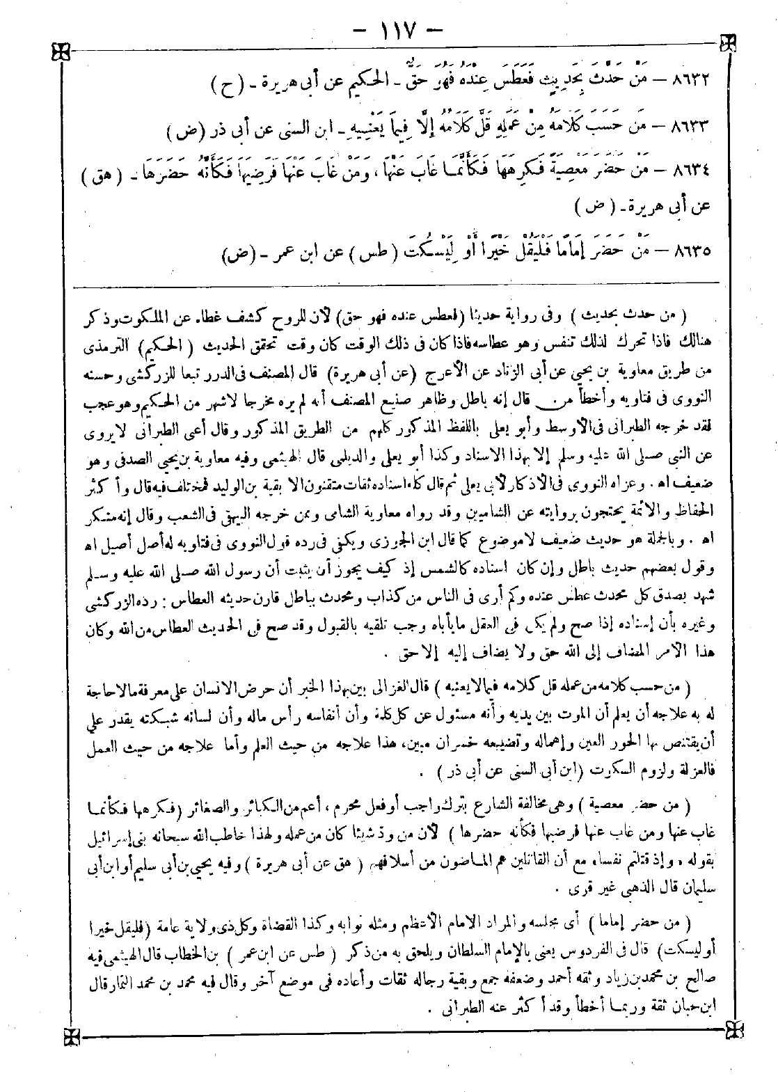 8633 - (من حسب كلامه من عمله قل كلامه فيما لا يعنيه) قال الغزالي: بين بهذا الخبر أن حرص الإنسان على معرفة ما لا حاجة له به علاجه أن يعلم أن الموت بين يديه وأنه مسؤول عن كل كلمة وأن أنفاسه رأس ماله وأن لسانه شبكته يقدر على أن يقتنص بها الحور العين وإهماله وتضييعه خسران مبين هذا علاجه من حيث العلم وأما علاجه من حيث العمل فالعزلة ولزوم السكوت