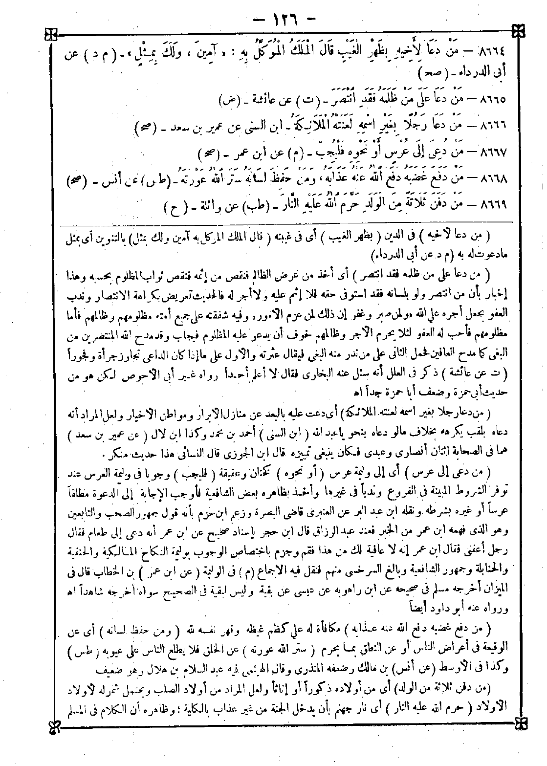 8667 - (من دعي إلى عرس) أي إلى وليمة عرس (أو نحوه) كختان وعقيقة (فليجب) وجوبا في وليمة العرس عند توفر الشروط المبينة في الفروع وندبا في غيرها وأخذ بظاهره بعض الشافعية فأوجب الإجابة إلى الدعوة مطلقا عرسا أو غيره بشرطه ونقله ابن عبد البر عن العنبري قاضي البصرة وزعم ابن حزم بأنه قول جمهور الصحب والتابعين وهو الذي فهمه ابن عمر من الخبر فعند عبد الرزاق قال ابن حجر: بإسناد صحيح عن ابن عمر أنه دعي إلى طعام فقال رجل: أعفني فقال ابن عمر: إنه لا عافية لك من هذا فقم وجزم باختصاص الوجوب بوليمة النكاح المالكية والحنفية والحنابلة وجمهور الشافعية وبالغ السرخسي منهم فنقل فيه الإجماع