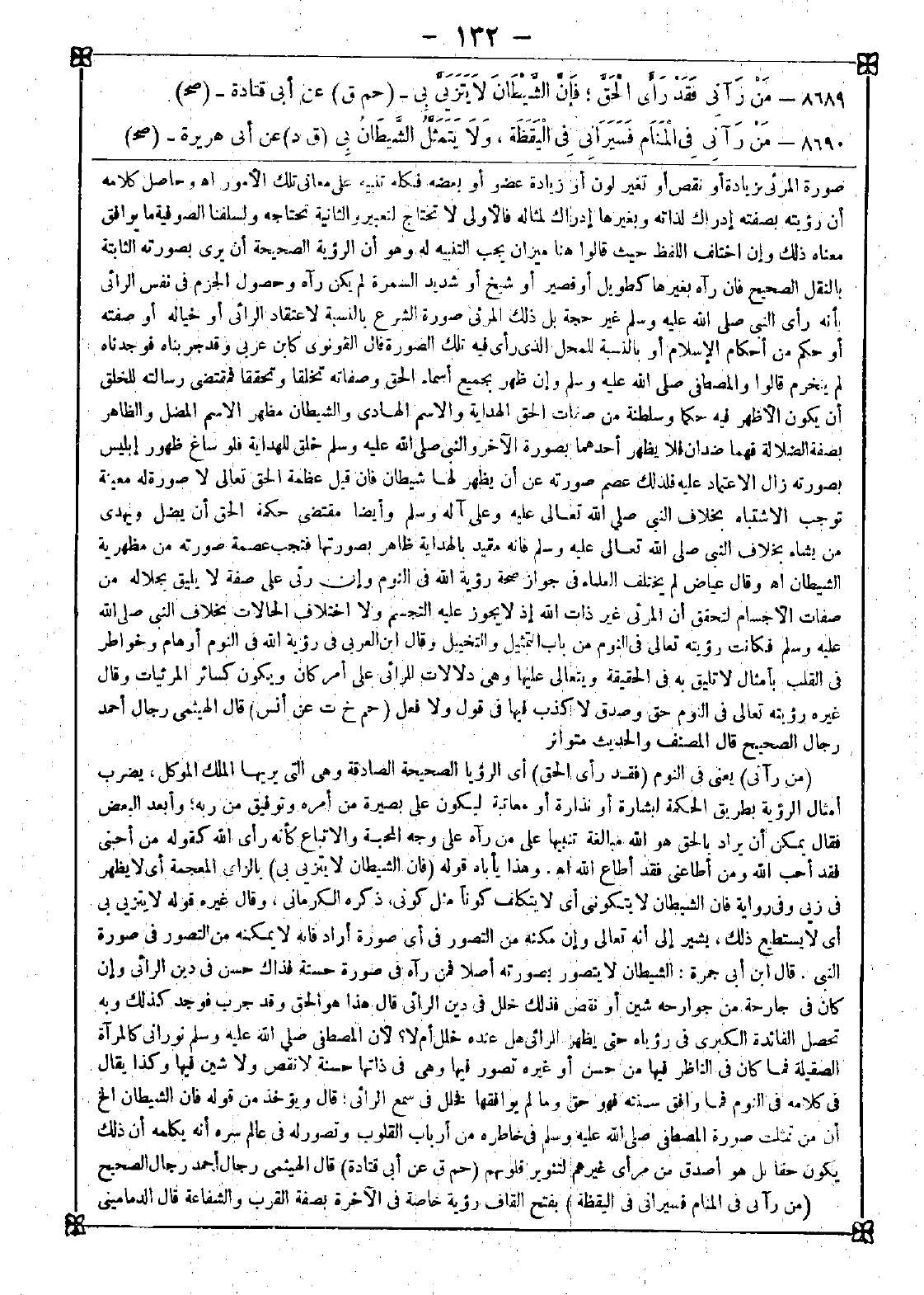 8690 - (من رآني في المنام فسيراني في اليقظة) بفتح القاف رؤية خاصة في الآخرة بصفة القرب والشفاعة قال الدماميني: -[133]- وهذه بشارة لرائيه بموته على الإسلام لأنه لا يراه في القيامة تلك الرؤية الخاصة باعتبار القرب منه إلا من تحقق منه الوفاة على الإسلام اه. وقال جمع منهم ابن أبي جمرة: بل يراه في الدنيا حقيقة قال: وذا عام في أهل التوفيق ومحتمل في غيرهم فإن خرق العادة قد يقع للزنديق إغواء وإملاء وقد نص على إمكان رؤيته بل وقوعها أعلام منهم حجة الإسلام وقول ابن حجر يلزم عليه أن هؤلاء صحابة وبقاء الصحبة للقيامة رد بأن شرط الصحبة رؤيته على الوجه المتعارف قال الحجة: وليس المراد أنه يرى بدنه بل مثالا له صار آلة يتأدى بها المعنى والآلة تكون حقيقية وخيالية والنفس غير المثال المتخيل فما رآه من التشكل ليس روح النبي صلى الله عليه وسلم ولا شخصه بل مثاله اه وقال الشاذلي: لو حجب عني طرفة عين ما عددت نفسي مسلما وكان بعضهم إذا سئل عن شيء قال: حتى أعرضه عليه ثم يطرق ثم يقول: قال كذا فيكون كما أخبر لا يتخلف (ولا يتمثل الشيطان بي) استئناف جواب لمن قال ما سبب ذلك يعني ليس ذلك المنام من قبيل تمثل الشيطان بي في خيال الرائي بما شاء من التخيلات