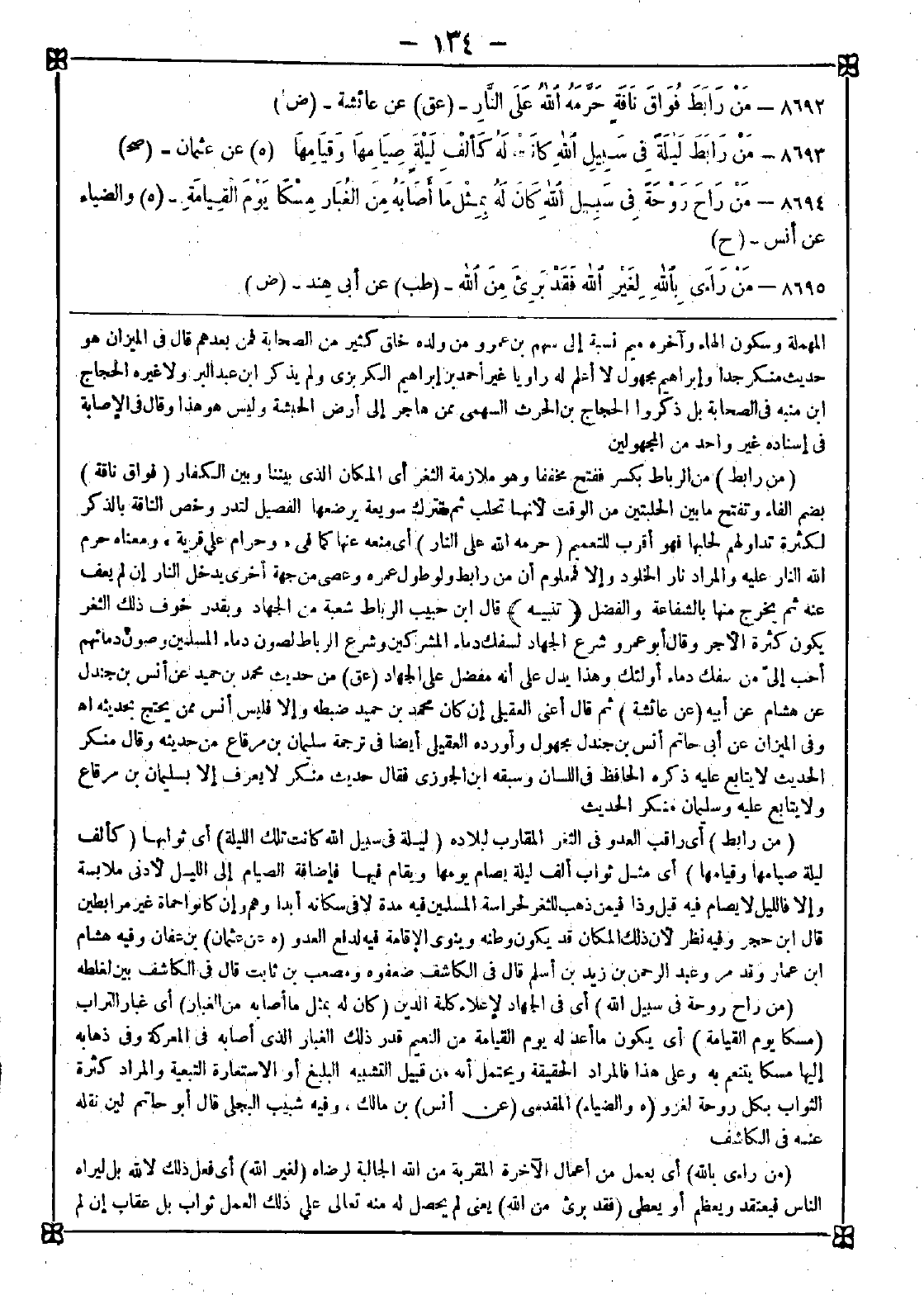 8692 - (من رابط) من الرباط بكسر ففتح مخففا وهو ملازمة الثغر أي المكان الذي بيننا وبين الكفار (فواق ناقة) بضم الفاء وتفتح ما بين الحلبتين من الوقت لأنها تحلب ثم تترك سويعة يرضعها الفصيل لتدر وخص الناقة بالذكر لكثرة تداولها لحلبها فهو أقرب للتعميم (حرمه الله على النار) أي منعه عنها كما في {وحرام على قرية} ومعناه حرم الله النار عليه والمراد نار الخلود وإلا فمعلوم أن من رابط ولو طول عمره وعصى من جهة أخرى يدخل النار إن لم يعف عنه ثم يخرج منها بالشفاعة والفضل