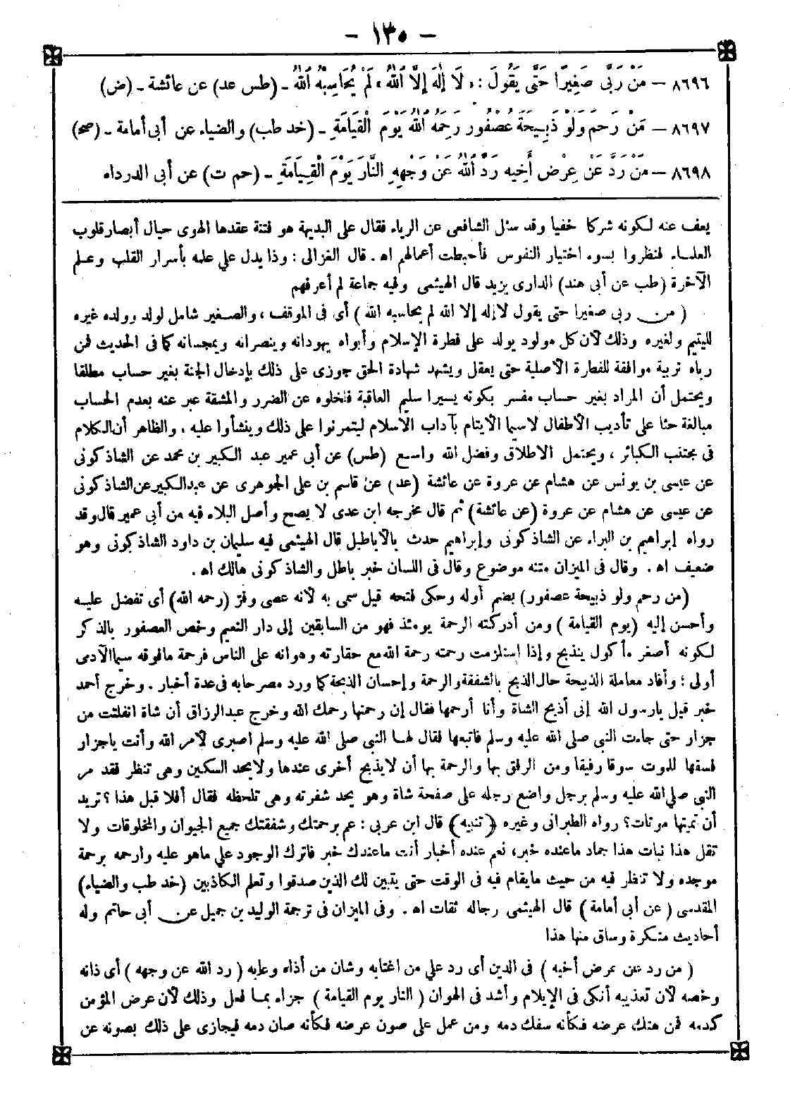 8696 - (من ربي صغيرا حتى يقول لا إله إلا الله لم يحاسبه الله) أي في الموقف والصغير شامل لولد وولده غيره لليتيم ولغيره وذلك لأن كل مولود يولد على فطرة الإسلام وأبواه يهودانه وينصرانه ويمجسانه كما في الحديث فمن رباه تربية موافقة للفطرة الأصلية حتى يعقل ويشهد شهادة الحق جوزي على ذلك بإدخال الجنة بغير حساب مطلقا ويحتمل أن المراد بغير حساب مفسر بكونه يسيرا سليم العاقبة فلخلوه عن الضرر والمشقة عبر عنه بعدم الحساب مبالغة حثا على تأديب الأطفال لا سيما الأيتام بآداب الإسلام ليتمرنوا على ذلك وينشأوا عليه والظاهر أن الكلام في مجتنب الكبائر ويحتمل الإطلاق وفضل الله واسع