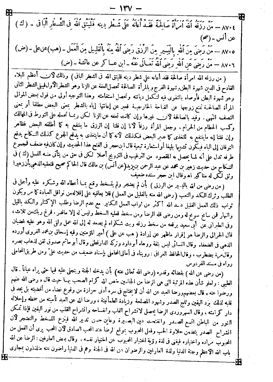 -[137]- 8704 - (من رزقه الله امرأة صالحة فقد أعانه على شطر دينه فليتق الله في الشطر الباقي) وذلك لأن أعظم البلاء الفادح في الدين شهوة البطن وشهوة الفرج وبالمرأة الصالحة تحصل العفة عن الزنا وهو الشطر الأول فيبقى الشطر الثاني وهو شهوة البطن فأوصاه بالتقوى فيه لتكمل ديانته وتحصل استقامته وهذا التوجيه أولى من قول بعض الموالي المرأة الصالحة تمنع زوجها عن القباحة الخارجية فعبر عن إعانتها إياه بالشطر بمعنى البعض مطلقا أو بمعنى النصف انتهى. وقيد بالصالحة لأن غيرها وإن كانت تعفه عن الزنا لكن ربما تحمله على التورط في المهالك وكسب الحطام من الحرام وجعل المرأة رزقا لأنا إن قلنا إن الرزق ما ينتفع به كما أطلقه البعض فظاهر وإن قلنا إنه ما ينتفع به للتغذي كما عبر البعض فكذلك لأنه كما أن ما يتغذى به يدفع الجوع كذلك النكاح يدفع التوقان إلى الباه فيكون تشبيها بليغا أو استعارة تبعية قال ابن حجر في الفتح: هذا الحديث وإن كان فيه ضعف فمجموع طرقه تدل على أنه لما يحصل به المقصود من الترغيب في التزويج أصلا لكن في حق من يتأتى منه النسل