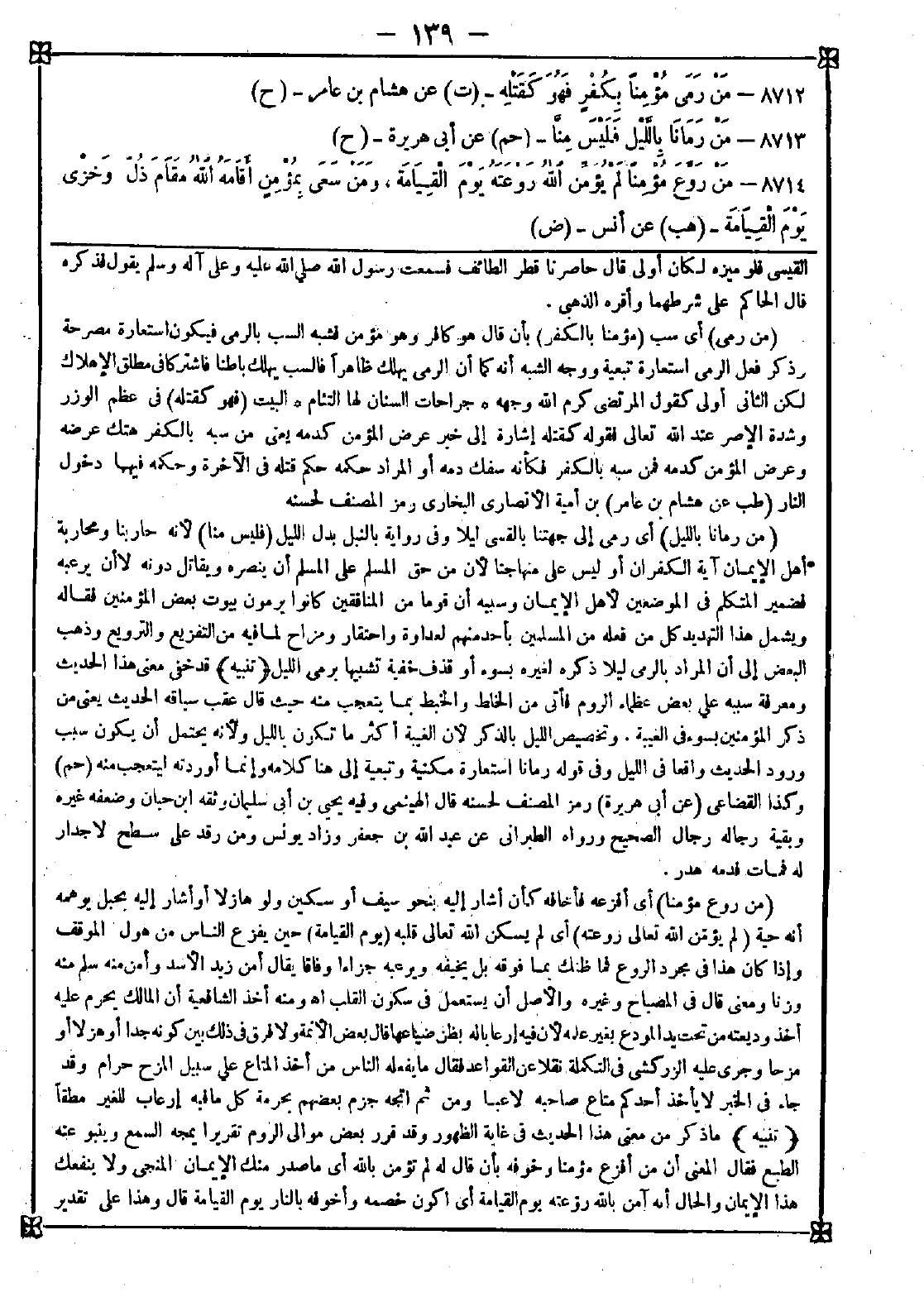 8712 - (من رمى) أي سب (مؤمنا بالكفر) بأن قال هو كافر وهو مؤمن فشبه السب بالرمي فيكون استعارة مصرحة وذكر فعل الرمي استعارة تبعية ووجه الشبه أنه كما أن الرمي يهلك ظاهرا فالسب يهلك باطنا فاشتركا في مطلق الإهلاك لكن الثاني أولى كقول المرتضى كرم الله وجهه " جراحات السنان لها التئام ". البيت. (فهو كقتله) في عظم الوزر وشدة الإصر عند الله تعالى فقوله كقتله إشارة إلى خبر عرض المؤمن كدمه يعني من سبه بالكفر هتك عرضه وعرض المؤمن كدمه فمن سبه بالكفر فكأنه سفك دمه أو المراد حكمه حكم قتله في الآخرة وحكمه فيها دخول النار