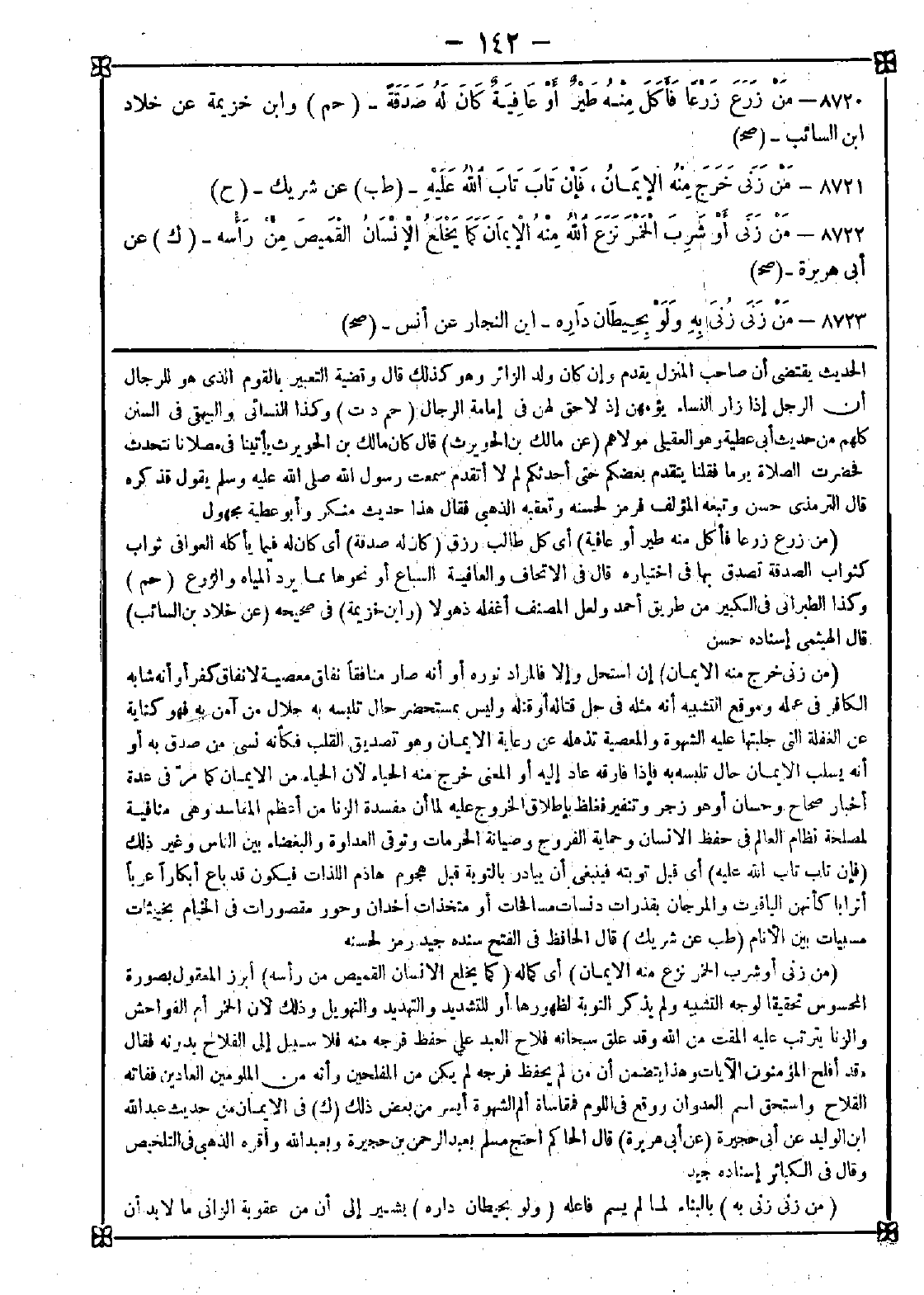 8721 - (من زنى خرج منه الإيمان) إن استحل وإلا فالمراد نوره أو أنه صار منافقا نفاق معصية لا نفاق كفر أو أنه شابه الكافر في عمله وموقع التشبيه أنه مثله في حل قتاله أو قتله وليس بمستحضر حال تلبسه به حلال من آمن به فهو كناية عن الغفلة التي جلبتها عليه الشهوة والمعصية تذهله عن رعاية الإيمان وهو تصديق القلب فكأنه نسي من صدق به أو أنه يسلب الإيمان حال تلبسه به فإذا فارقه عاد إليه أو المعنى خرج منه الحياء لأن الحياء من الإيمان كما مر في عدة أخبار صحاح وحسان أو هو زجر وتنفير فغلظ بإطلاق الخروج عليه لما أن مفسدة الزنا من أعظم المفاسد وهي منافية لمصلحة نظام العالم في حفظ الإنسان وحماية الفروج وصيانة الحرمات وتوقي العداوة والبغضاء بين الناس وغير ذلك (فإن تاب تاب الله عليه) أي قبل توبته فينبغي أن يبادر بالتوبة قبل هجوم هاذم اللذات فيكون قد باع أبكارا عربا أترابا كأنهن الياقوت والمرجان بقذرات دنسات مسافحات أو متخذات أخدان وحور مقصورات في الخيام بخيثات مسبيات بين الأنام