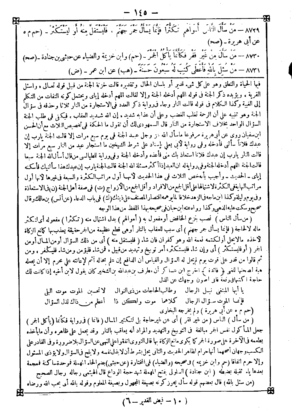 8730 - (من سأل) الناس (من غير فقر) أي عن غير حاجة بل لتكثير المال (فإنما) في رواية فكأنما (يأكل الجمر) جعل المأكول نفس الجمر مبالغة في التوبيخ والتهديد والمراد أنه يعاقب بالنار وقد يجعل على ظاهره وأن ما يأخذه يطعمه في الآخرة على صورة الجمر كما يكوى مانع الزكاة بها قال النووي: اتفقوا على النهي عن السؤال بلا ضرورة وفي القادر على الكسب وجهان أصحهما أنها حرام لظاهر الحديث والثاني يحل بشرط أن لا يذل نفسه ولا يلح في السؤال ولا يؤذي المسؤول وإلا حرم اتفاقا