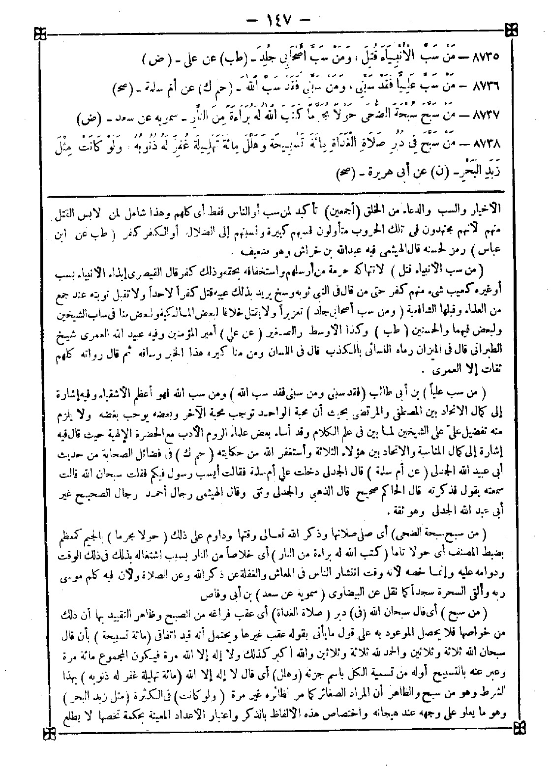 8735 - (من سب الأنبياء قتل) لانتهاكه حرمة من أرسلهم واستخفافه بحقه وذلك كفر قال القيصري: إيذاء الأنبياء بسبب أو غيره كعيب شيء منهم كفر حتى من قال في النبي ثوبه وسخ يريد بذلك عيبه قتل كفرا لا حدا ولا تقبل توبته عند جمع من العلماء وقبلها الشافعية (ومن سب أصحابي جلد) تعزيرا ولا يقتل خلافا لبعض المالكية ولبعض منا في ساب الشيخين ولبعض فيهما والحسنين