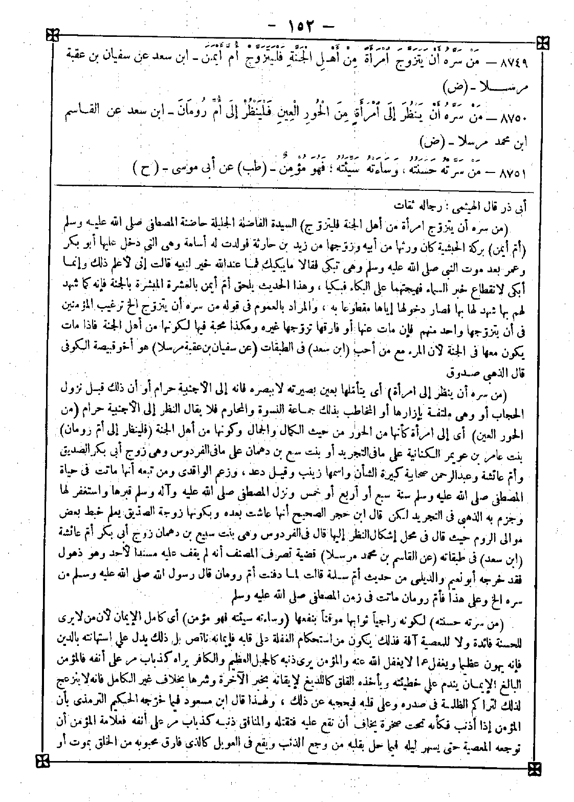 8750 - (من سره أن ينظر إلى امرأة) أي يتأملها بعين بصيرته لا ببصره فإنه إلى الأجنبية حرام أو أن ذلك قبل نزول الحجاب أو وهي ملتفة بإزارها أو المخاطب بذلك جماعة النسوة والمحارم فلا يقال النظر إلى الأجنبية حرام (من الحور العين) أي إلى امرأة كأنها من الحور من حيث الكمال والجمال وكونها من أهل الجنة (فلينظر إلى أم رومان) بنت عامر بن عويمر الكنانية على ما في التجريد أو بنت سبع بن دهمان على ما في الفردوس وهي زوج أبي بكر الصديق وأم عائشة وعبد الرحمن صحابية كبيرة الشأن واسمها زينب وقيل دعد وزعم الواقدي ومن تبعه أنها ماتت في حياة المصطفى صلى الله عليه وسلم سنة سبع أو أربع أو خمس ونزل المصطفى صلى الله عليه وآله وسلم قبرها واستغفر لها وجزم به الذهبي في التجريد لكن قال ابن حجر: الصحيح أنها عاشت بعده وبكونها زوجة الصديق يعلم خبط بعض موالي الروم حيث قال في محل إشكال النظر إليها قال في الفردوس: وهي بنت سبيع بن دهمان زوج أبي بكر أم عائشة