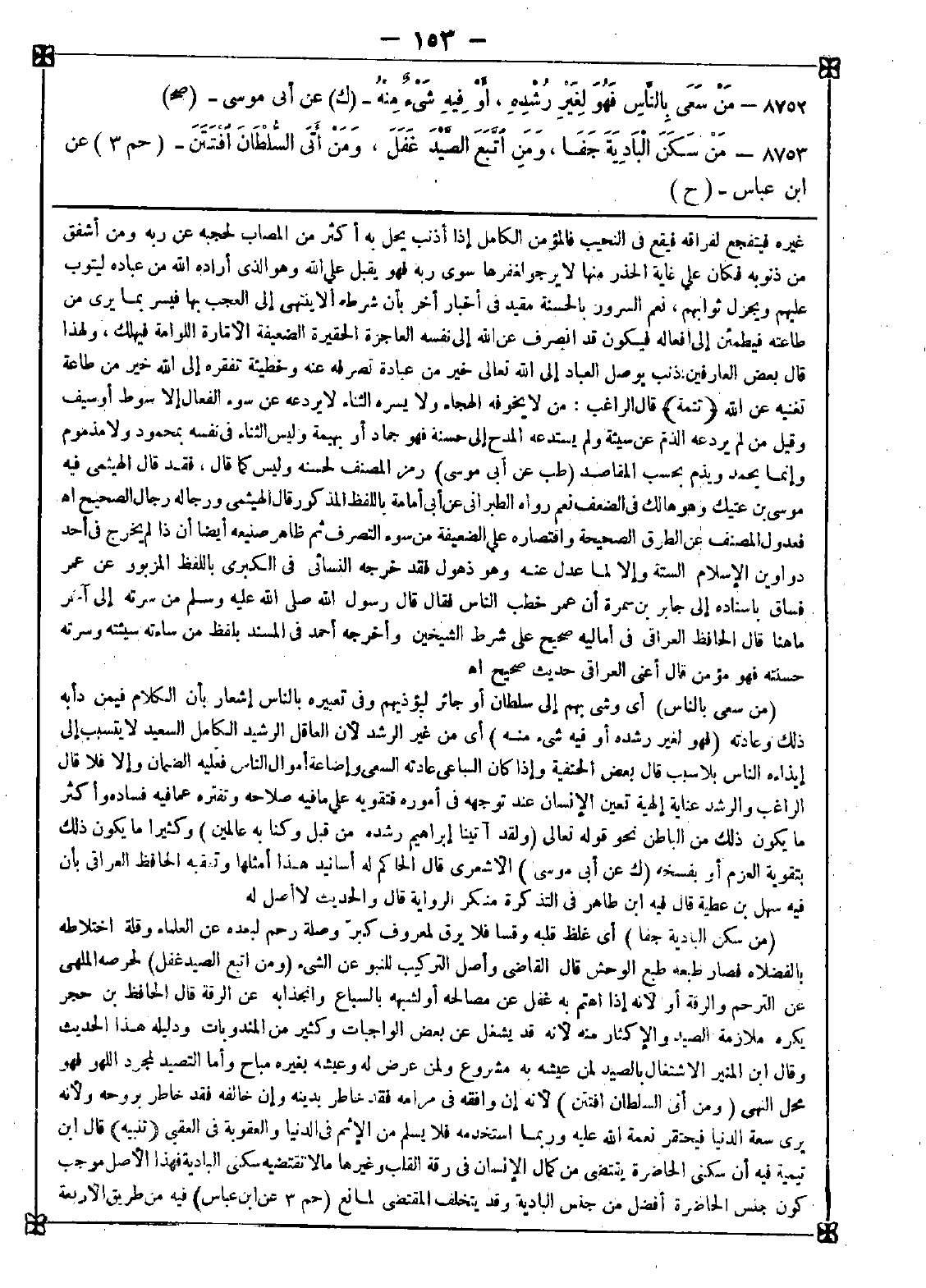 8752 - (من سعى بالناس) أي وشى بهم إلى سلطان أو جائر ليؤذيهم وفي تعبيره بالناس إشعار بأن الكلام فيمن دأبه ذلك وعادته (فهو لغير رشده أو فيه شيء منه) أي من غير الرشد لأن العاقل الرشيد الكامل السعيد لا يتسبب إلى إيذاءه الناس بلا سبب قال بعض الحنفية: وإذا كان الساعي عادته السعي وإضاعة أموال الناس فعليه الضمان وإلا فلا قال الراغب: والرشد عناية إلهية تعين الإنسان عند توجهه في أموره فتقويه على ما فيه صلاحه وتفتره عما فيه فساده وأكثر ما يكون ذلك من الباطن نحو قوله تعالى {ولقد آتينا إبراهيم رشده من قبل وكنا به عالمين} وكثيرا ما يكون ذلك بتقوية العزم أو بفسخه