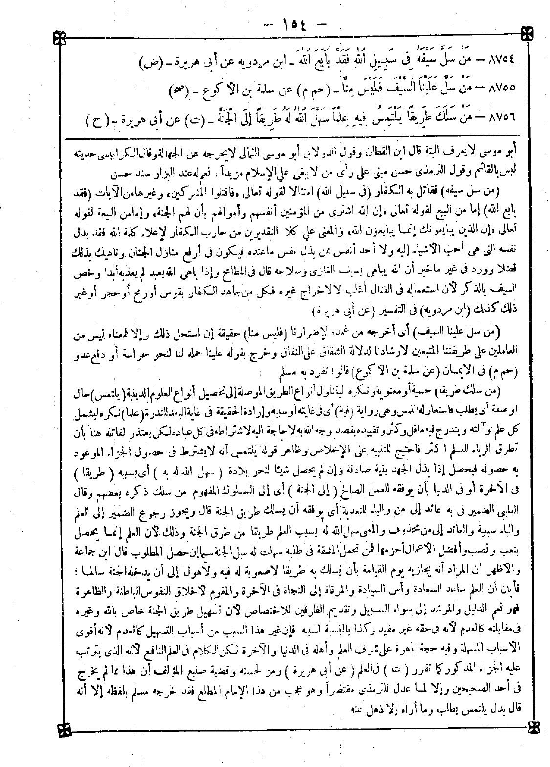 8756 - (من سلك طريقا) حسية أو معنوية ونكره ليتناول أنواع الطريق الموصلة إلى تحصيل أنواع العلوم الدينية (يلتمس) حال أو صفة أي يطلب فاستعار له اللمس وهي رواية (فيه) أي في غايته أو سببه وإرادة الحقيقة في غاية البعد للندرة (علما) نكره ليشمل كل علم وآلته ويندرج فيه ما قل وكثر وتقييده بقصد وجه الله به لا حاجة إليه لاشتراطه في كل عبادة لكن يعتذر لقائله هنا بأن تطرق الرياء للعلم أكثر فاحتيج للتنبيه على الإخلاص وظاهر قوله يلتمس أنه لا يشترط في حصول الجزاء الموعود به حصوله فيحصل إذا بذل الجهد بنية صادقة وإن لم يحصل شيئا لنحو بلادة (سهل الله له به) أي بسببه (طريقا) في الآخرة أو في الدنيا بأن يوفقه للعمل الصالح (إلى الجنة) أي إلى السلوك المفهوم من سلك ذكره بعضهم وقال الطيبي: الضمير في به عائد إلى من والباء للتعدية أي يوفقه أن يسلك طريق الجنة قال: ويجوز رجوع الضمير إلى العلم والباء سببية والعائد إلى من محذوف والمعنى سهل الله له بسبب العلم طريقا من طرق الجنة وذلك لأن العلم إنما يحصل بتعب ونصب وأفضل الأعمال أحزمها فمن تحمل المشقة في طلبه سهلت له سبل الجنة سيما إن حصل المطلوب قال ابن جماعة: والأظهر أن المراد أن يجازيه يوم القيامة بأن يسلك به طريقا لا صعوبة له فيه ولا هول إلى أن يدخله الجنة سالما فأبان أن العلم ساعد السعادة وأس السيادة والمرقاة إلى النجاة في الآخرة والمقوم لأخلاق النفوس الباطنة والظاهرة فهو نعم الدليل والمرشد إلى سواء السبيل وتقديم الظرفين للإختصاص لأن تسهيل طريق الجنة خاص بالله وغيره في مقابلته كالعدم لأنه في حقه غير مفيد وكذا بالنسبة لسببه فإن غير هذا السبب من أسباب التسهيل كالعدم لأنه أقوى الأسباب المسهلة وفيه حجة باهرة على شرف العلم وأهله في الدنيا والآخرة لكن الكلام في العلم النافع لأنه الذي يترتب عليه الجزاء المذكور كما تقرر
