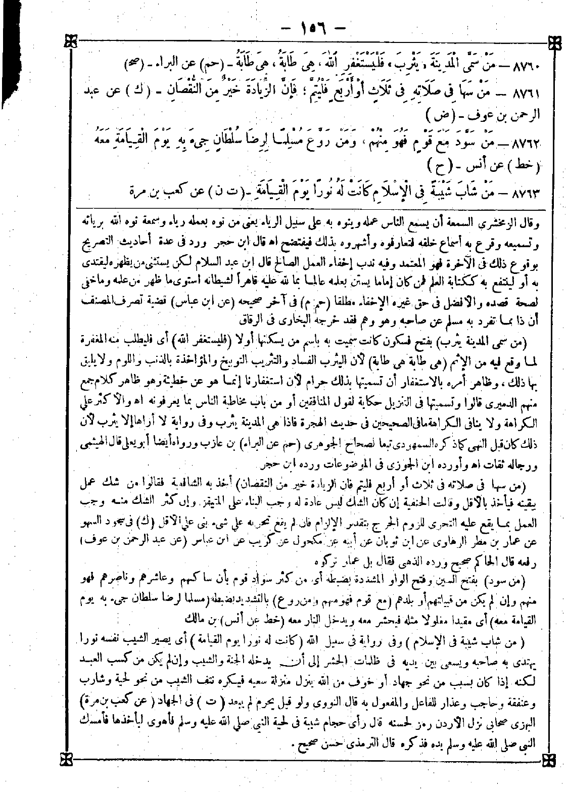 8762 - (من سود) بفتح السين وفتح الواو المشددة بضبطه أي من كثر سواد قوم بأن ساكنهم وعاشرهم وناصرهم فهو منهم وإن لم يكن من قبيلتهم أو بلدهم (مع قوم فهو منهم ومن روع) بالتشديد بضبطه (مسلما لرضا سلطان جيء به يوم القيامة معه) أي مقيدا مغلولا مثله فيحشر معه ويدخل النار معه