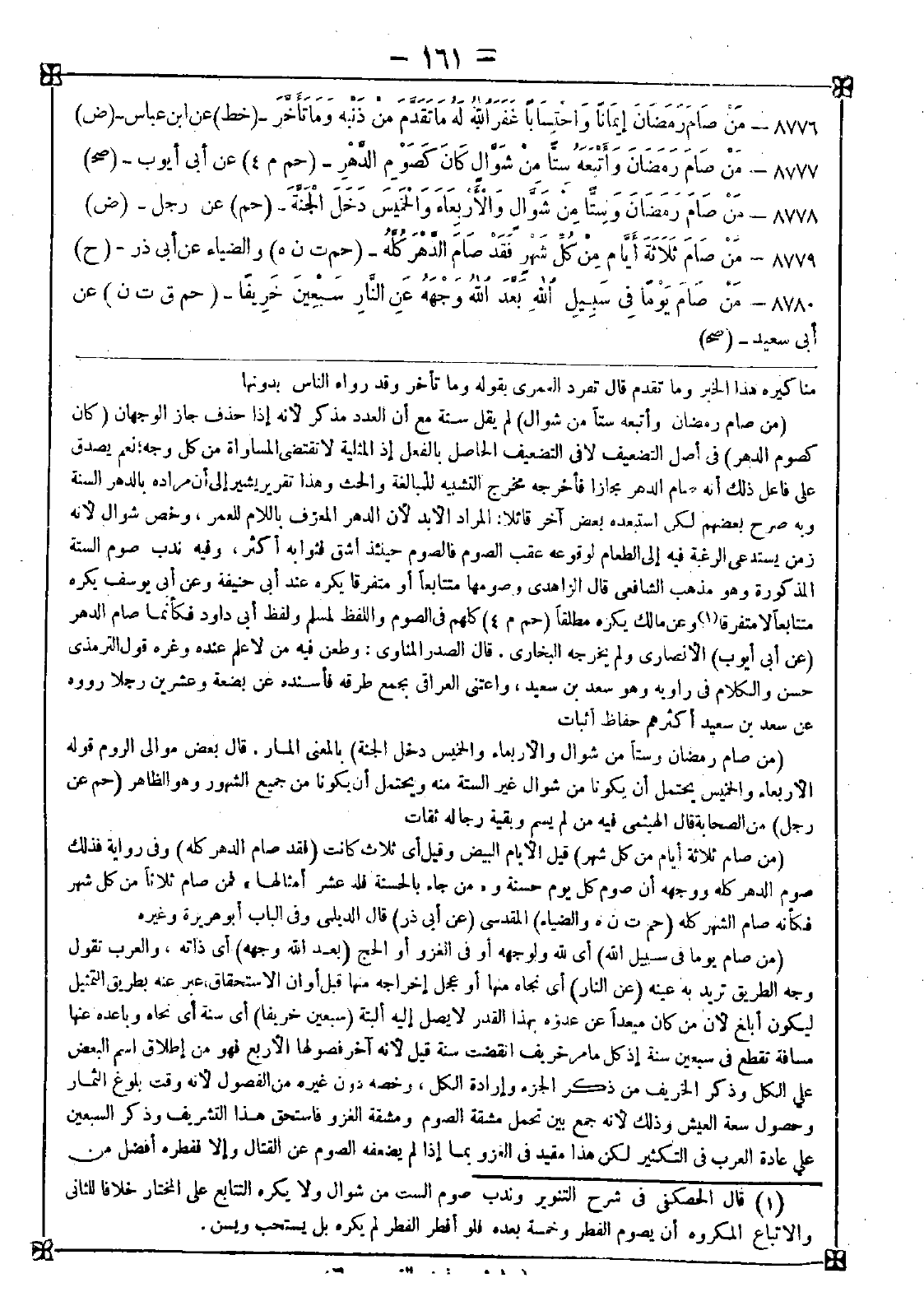 8777 - (من صام رمضان وأتبعه ستا من شوال) لم يقل ستة مع أن العدد مذكر لأنه إذا حذف جاز الوجهان (كان كصوم الدهر) في أصل التضعيف لا في التضعيف الحاصل بالفعل إذ المثلية لا تقتضي المساواة من كل وجه نعم يصدق على فاعل ذلك أنه صام الدهر مجازا فأخرجه مخرج التشبيه للمبالغة والحث وهذا تقرير يشير إلى أن مراده بالدهر السنة وبه صرح بعضهم لكن استبعده بعض آخر قائلا: المراد الأبد لأن الدهر المعرف باللام للعمر وخص شوال لأنه زمن يستدعي الرغبة فيه إلى الطعام لوقوعه عقب الصوم فالصوم حينئذ أشق فثوابه أكثر وفيه ندب صوم الستة المذكورة وهو مذهب الشافعي قال الزاهدي: وصومها متتابعا أو متفرقا يكره عند أبي حنيفة وعن أبي يوسف يكره متتابعا لا متفرقا (1) وعن مالك يكره مطلقا