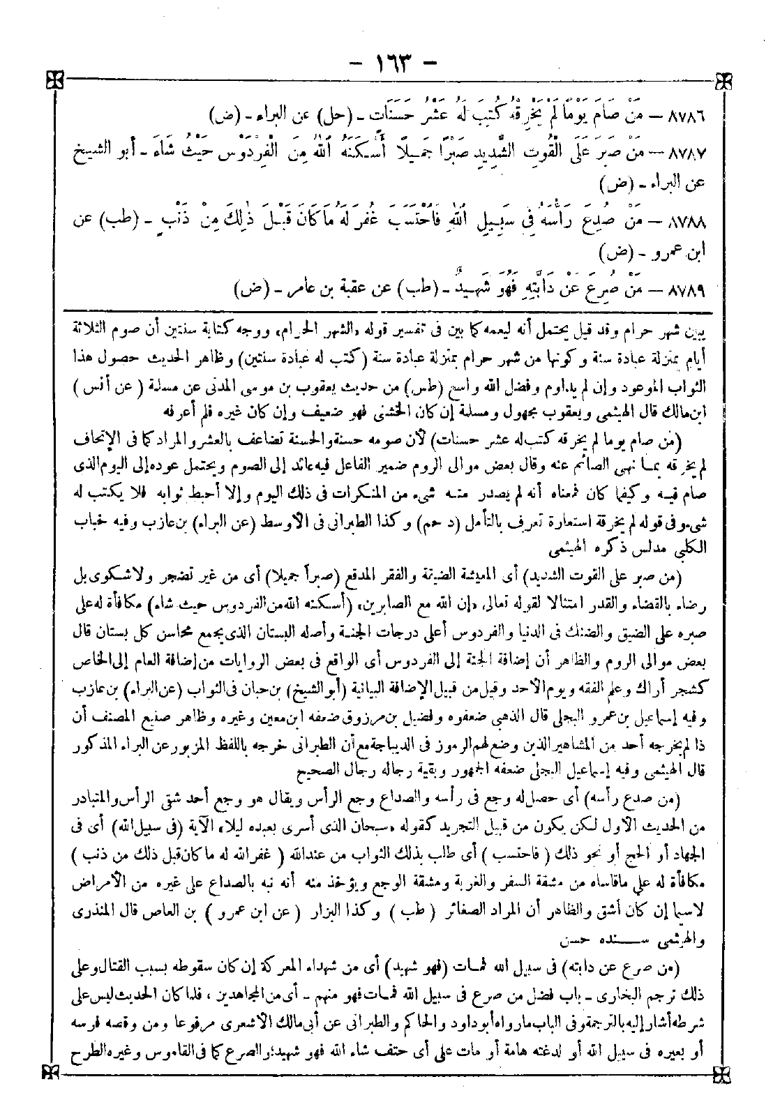 8788 - (من صدع رأسه) أي حصل له وجع في رأسه والصداع وجع الرأس ويقال هو وجع أحد شقي الرأس والمتبادر من الحديث الأول لكن يكون من قبيل التجريد كقوله {سبحان الذي أسرى بعبده ليلا} الآية (في سبيل الله) أي في الجهاد أو الحج أو نحو ذلك (فاحتسب) أي طلب بذلك الثواب من عند الله (غفر الله له ما كان قبل ذلك من ذنب) مكافأة له على ما قاساه من مشقة السفر والغربة ومشقة الوجع ويؤخذ منه أنه نبه بالصداع على غيره من الأمراض لا سيما إن كان أشق والظاهر أن المراد الصغائر