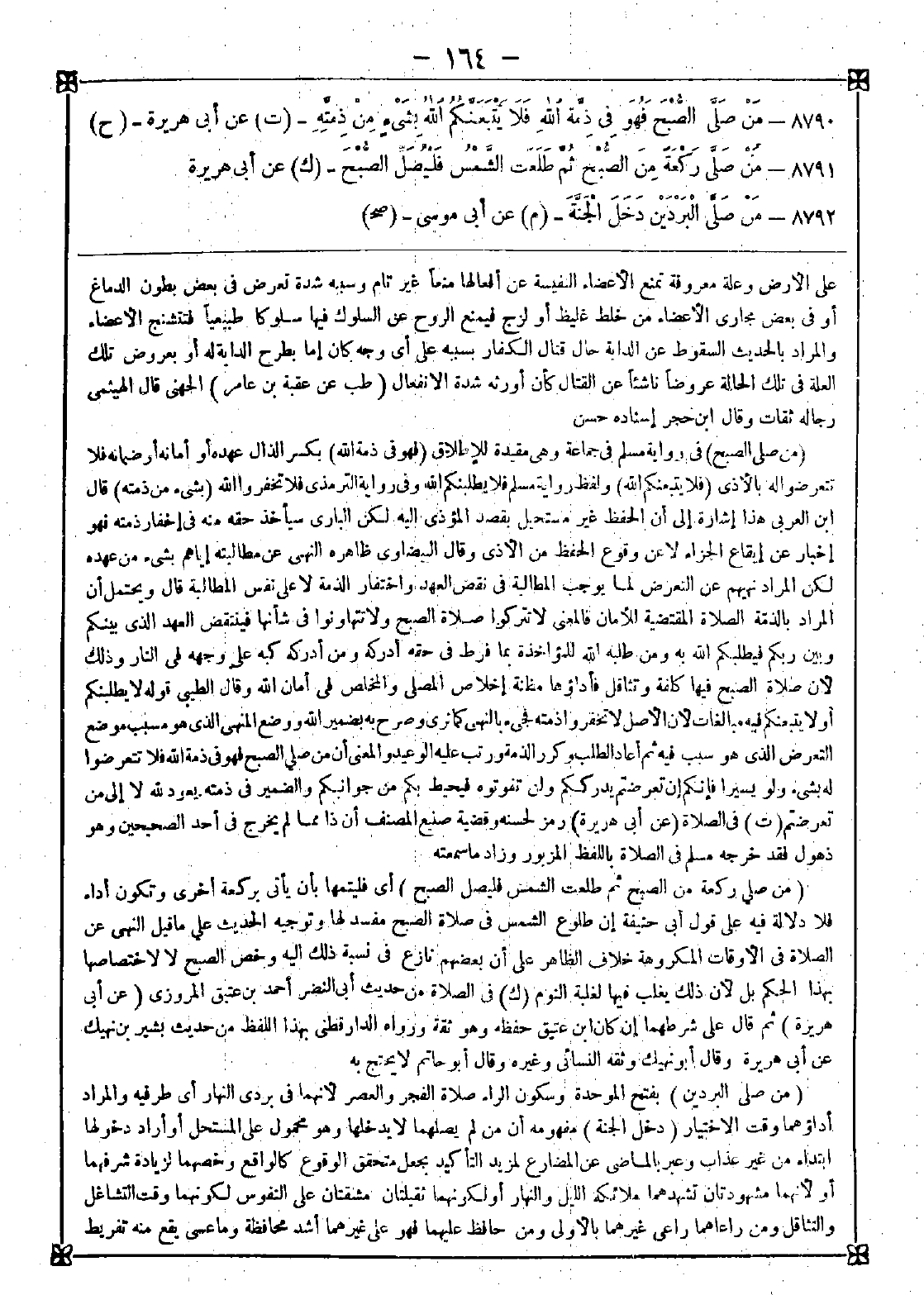8790 - (من صلى الصبح) في رواية مسلم في جماعة وهي مقيدة للإطلاق (فهو في ذمة الله) بكسر الذال عهده أو أمانه أو ضمانه فلا تتعرضوا له بالأذى (فلا يتبعنكم الله) ولفظ رواية مسلم فلا يطلبنكم الله وفي رواية الترمذي فلا تخفروا الله (بشيء من ذمته) قال ابن العربي: هذا إشارة إلى أن الحفظ غير مستحيل بقصد المؤذي إليه لكن الباري سيأخذ حقه منه في إخفار ذمته فهو إخبار عن إيقاع الجزاء لا عن وقوع الحفظ من الأذى وقال البيضاوي: ظاهره النهي عن مطالبته إياهم بشيء من عهده لكن المراد نهيهم عن التعرض لما يوجب المطالبة في نقض العهد واختفار الذمة لا على نفس المطالبة قال: ويحتمل أن المراد بالذمة الصلاة المقتضية للأمان فالمعنى لا تتركوا صلاة الصبح ولا تتهاونوا في شأنها فينتقض العهد الذي بينكم وبين ربكم فيطلبكم الله به ومن طلبه الله للمؤاخذة بما فرط في حقه أدركه ومن أدركه كبه على وجهه في النار وذلك لأن صلاة الصبح فيها كلفة وتثاقل فأداؤها مظنة إخلاص المصلي والمخلص في أمان الله وقال الطيبي: قوله لا يطلبنكم أو لا يتبعنكم فيه مبالغات لأن الأصل لا تخفروا ذمته فجيء بالنهي كما ترى وصرح به بضمير الله ووضع المنهي الذي هو مسبب موضع التعرض الذي هو سبب فيه ثم أعاد الطلب وكرر الذمة ورتب عليه الوعيد والمعنى أن من صلى الصبح فهو في ذمة الله فلا تتعرضوا له بشيء ولو يسيرا فإنكم إن تعرضتم يدرككم ولن تفوتوه فيحيط بكم من جوانبكم والضمير في ذمته يعود لله لا إلى من تعرضتم