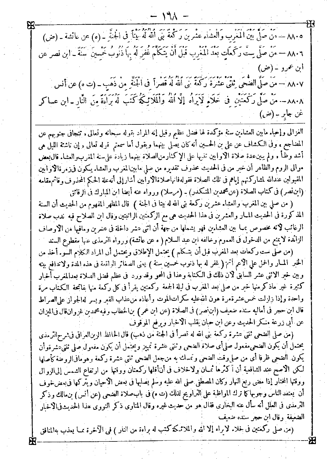 8805 - (من صلى بين المغرب والعشاء عشرين ركعة بنى الله له بيتا في الجنة) قال المظهر: المفهوم من الحديث أن السنة المذكورة في الحديث المار والعشرين في هذا الحديث هي مع الركعتين الراتبتين وقال ابن الصلاح: فيه ندب صلاة الرغائب لأنه مخصوص بما بين العشاءين فهو يشملها من جهة أن اثنى عشر داخلة في عشرين وما فيها من الأوصاف الزائدة لا يمنع من الدخول في العموم وخالفه ابن عبد السلام