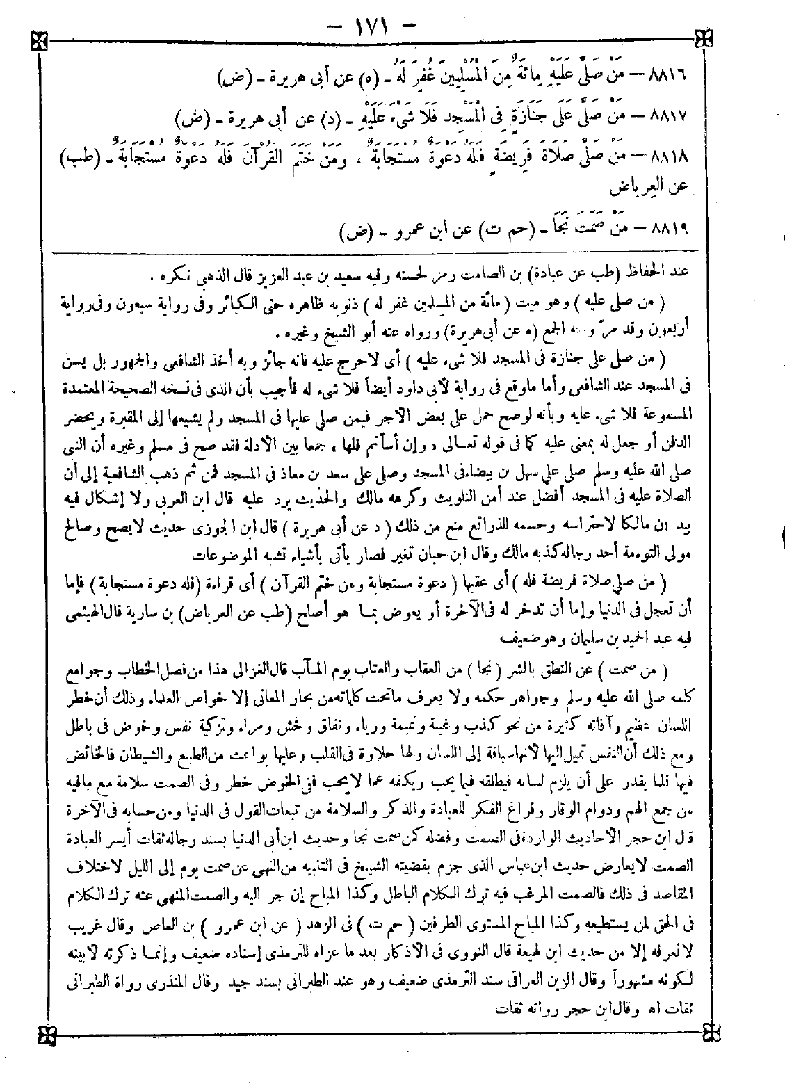 8816 - (من صلى عليه) وهو ميت (مئة من المسلمين غفر له) ذنوبه ظاهره حتى الكبائر وفي رواية سبعون وفي رواية أربعون وقد مر وجه الجمع