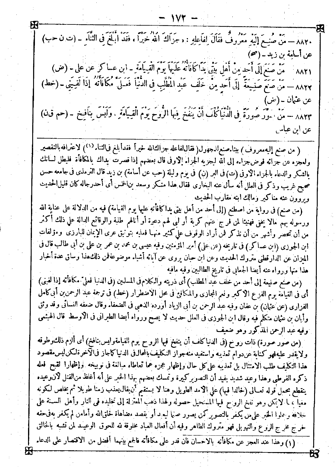 -[172]- 8820 - (من صنع إليه معروف) ببناء صنع للمجهول (فقال لفاعله جزاك الله خيرا فقد أبلغ في الثناء (1)) لاعترافه بالتقصير ولعجزه عن جزائه فوض جزاءه إلى الله ليجزيه الجزاء الأوفى قال بعضهم: إذا قصرت يداك بالمكافأة فليطل لسانك بالشكر والدعاء بالجزاء الأوفى