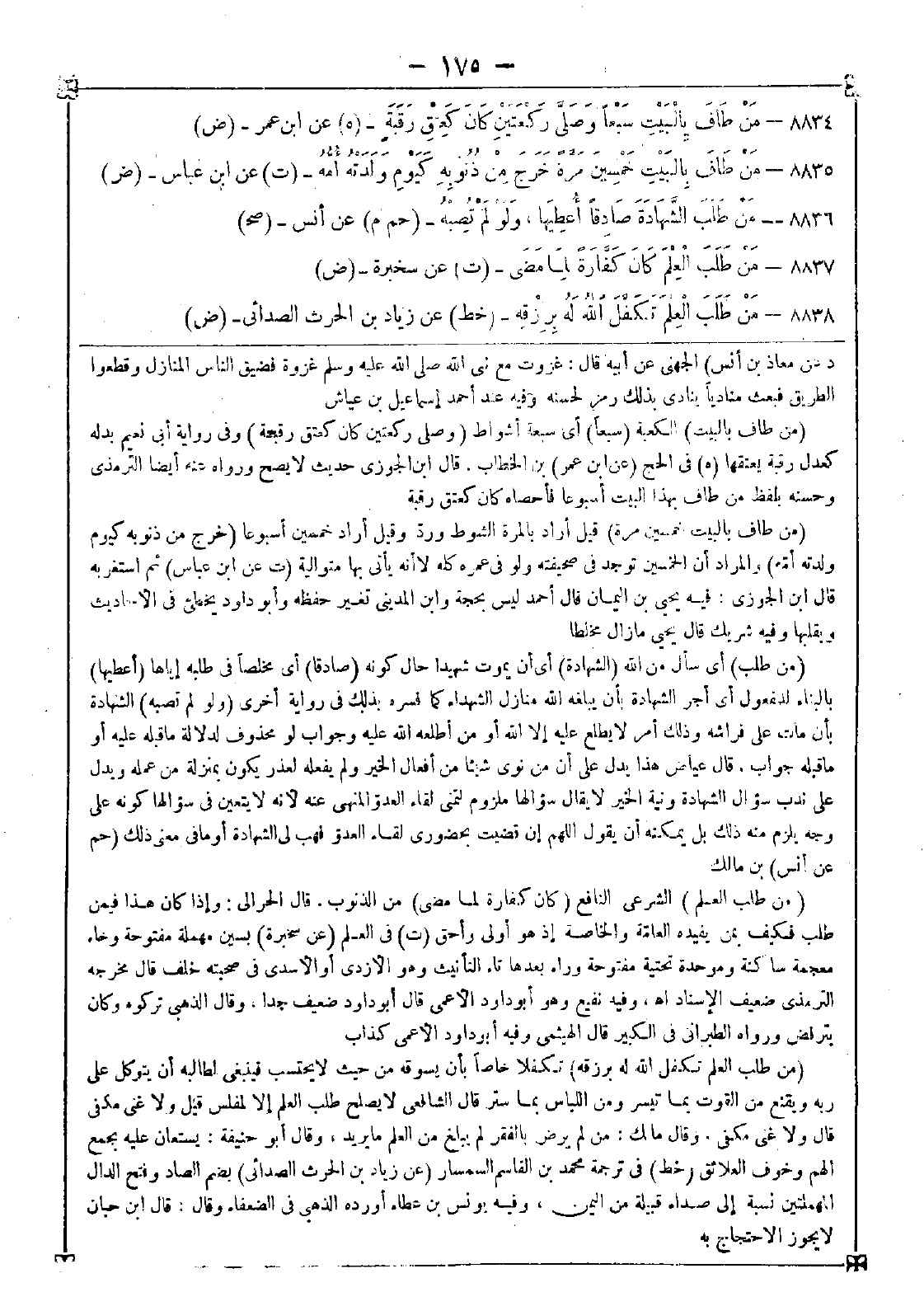 8835 - (من طاف بالبيت خمسين مرة) قيل أراد بالمرة الشوط ورد وقيل أراد خمسين أسبوعا (خرج من ذنوبه كيوم ولدته أمه) والمراد أن الخمسين توجد في صحيفته ولو في عمره كله لا أنه يأتي بها متوالية