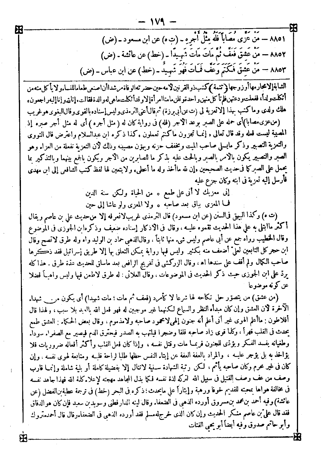 8852 - (من عشق) من يتصور حل نكاحه لها شرعا لا كأمرد (فعف ثم مات مات شهيدا) أي يكون من شهداء الآخرة لأن العشق وإن كان مبدأه النظر والسماع لكنهما غير موجبين له فهو فعل الله بالعبد بلا سبب ولهذا قال أفلاطون: ما أعلم الهوى غير أني أعلم أنه جنون إلهي لا محمود صاحبه ولا مذموم وقال بعض الحكماء: العشق طمع يحدث في القلب قهرا وكلما قوي زاد صاحبه قلقا وضجرا فيلتهب به الصدر فيحترق الدم فيصير مع الصفراء سوداء وطغيانه يفسد الفكر ويؤدي للجنون فربما مات وقتل نفسه وإذا كان فعل القلب وأكثر أفعاله ضروريات فلا يؤاخذ به بل يؤجر عليه والمراد بالعفة العفة عن إيتاء النفس حظها طلبا لراحة قلبه ومتابعة لهوى نفسه وإن كان في غير محرم وكان صاحبه يأثم لكن رتبة الشهادة سنية لا تنال إلا بفضيلة كاملة أو بلية شاملة وإنما قارب وصف من عف وصف القتيل في سبيل الله لتركه لذة نفسه فكما بذل المجاهد مهجته لإعلاء كلمة الله فهذا جاهد نفسه في مخالفة هواها بمحبته للقديم خوفا ورهبة وإيثارا على ما يحدث ذكره في البحر