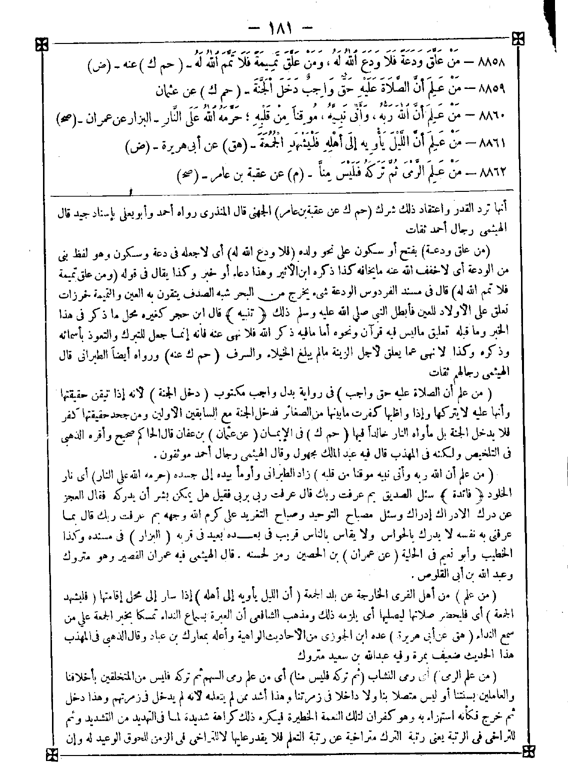 8858 - (من علق ودعة) بفتح أو سكون على نحو ولده (فلا ودع الله له) أي لا جعله في دعة وسكون وهو لفظ بنى من الودعة أي لا خفف الله عنه ما يخافه كذا ذكره ابن الأثير وهذا دعاء أو خبر وكذا يقال في قوله (ومن علق تميمة فلا تمم الله له) قال في مسند الفردوس: الودعة شيء يخرج من البحر شبه الصدف يتقون به العين والتميمة خرزات تعلق على الأولاد للعين فأبطل النبي صلى الله عليه وسلم ذلك