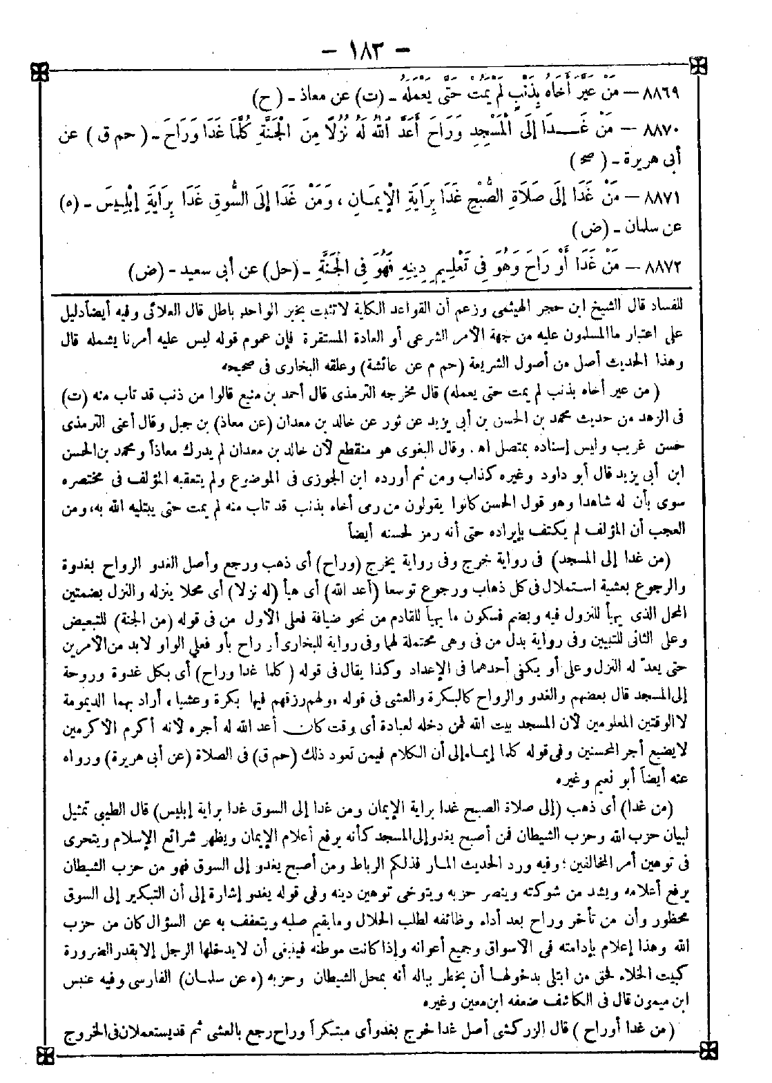 8872 - (من غدا أو راح) قال الزركشي: أصل غدا خرج بغدو أي مبتكرا أو راح رجع بالعشي ثم قد يستعملان في الخروج -[184]- مطلقا توسعا وهذا الحديث وما قبله يصلح أن يحمل على الأصل وعلى التوسع (وهو في تعليم دينه فهو في الجنة) أي إن قصد به وجه الله وعمل بعلمه وإحياء الشريعة وتنوير قلبه وتطهيره من كل غش ودنس وحقد وغل ليصلح بذلك لقبول العلم والإطلاع على دقائقه وحقائق غوامضه فإن العلم كما قيل صلاة السر وعبادة القلب وقربة الباطن وكما لا تصح الصلاة التي هي عبادة الجوارح الظاهرة إلا بطهارة الظاهر عن الحدث والخبث فلا يحصل العلم الذي هو عبادة القلب إلا بطهارته عن خبث الصفات ومساوئ الأخلاق والحاصل أن العلم إن خلصت فيه النية زكا ونما وأدخل صاحبه الجنة وإن قصد به غير الله حبط وضاع واستحق صاحبه النار