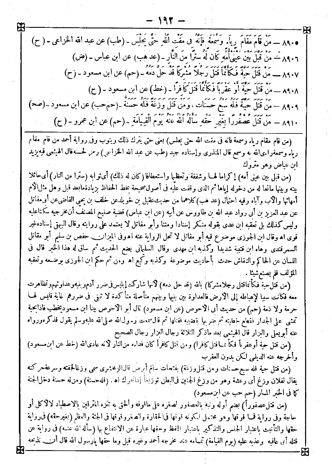 8907 - (من قتل حية فكأنما قتل رجلا مشركا) بالله (قد حل دمه) لأنها شاركت إبليس في ضرر آدم وبنيه وعداوتهم وتظاهرت معه فكانت سببا لإهباطه إلى الأرض فالعداوة بين بنيها وبينهم متأصلة متأكدة لا تبقى في ضررهم غاية فليس لها حرمة ولا ذمة