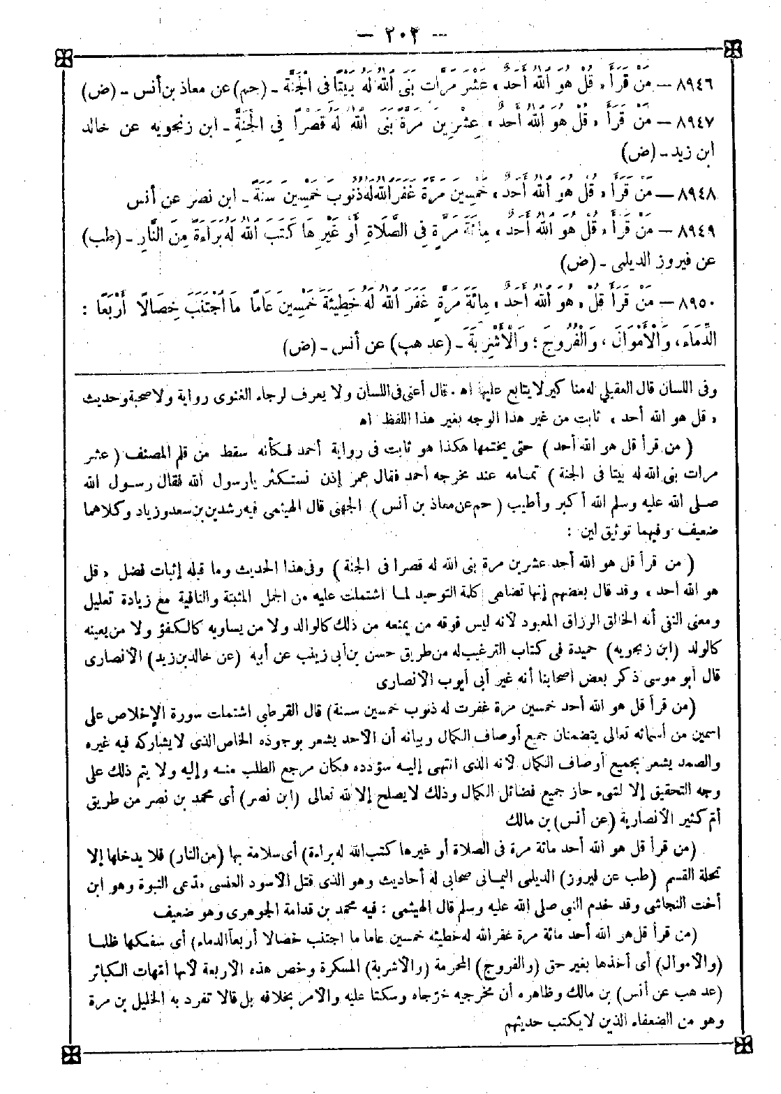 8948 - (من قرأ قل هو الله أحد خمسين مرة غفرت له ذنوب خمسين سنة) قال القرطبي: اشتملت سورة الإخلاص على اسمين من أسمائه تعالى يتضمنان جميع أوصاف الكمال وبيانه أن الأحد يشعر بوجوده الخاص الذي لا يشاركه فيه غيره والصمد يشعر بجميع أوصاف الكمال لأنه الذي انتهى إليه سؤدده فكان مرجع الطلب منه وإليه ولا يتم ذلك على وجه التحقيق إلا لشيء حاز جميع فضائل الكمال وذلك لا يصلح إلا لله تعالى