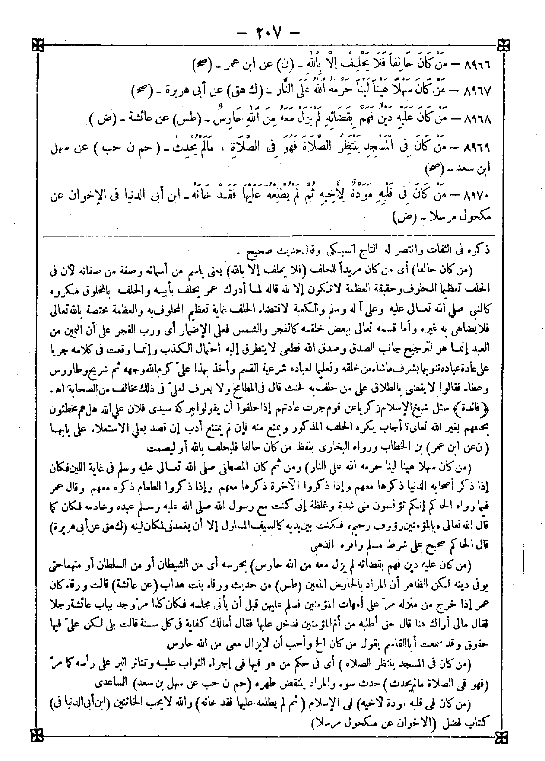 8968 - (من كان عليه دين فهم بقضائه لم يزل معه من الله حارس) يحرسه أي من الشيطان أو من السلطان أو منهما حتى يوفي دينه لكن الظاهر أن المراد بالحارس المعين