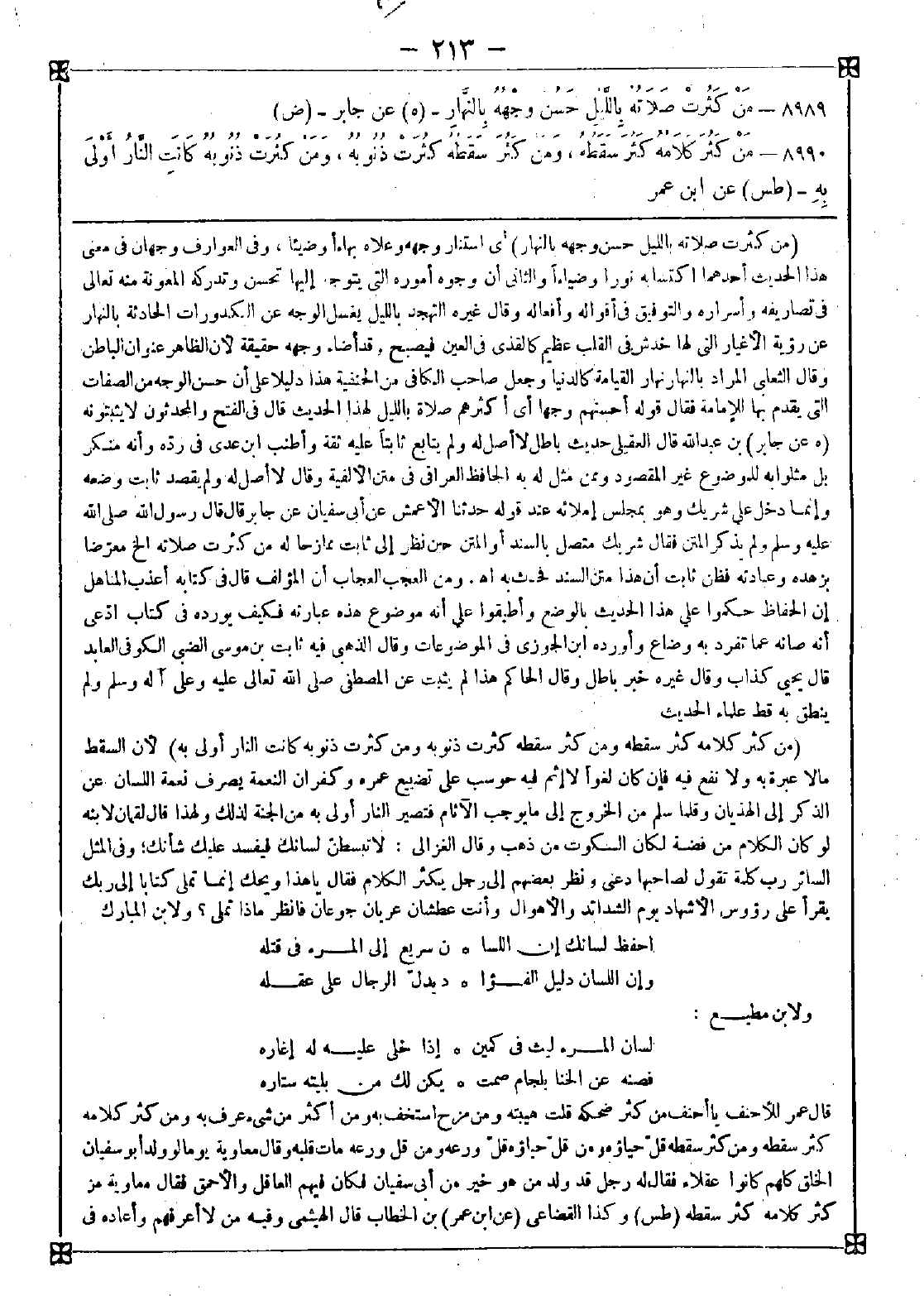 -[213]- 8989 - (من كثرت صلاته بالليل حسن وجهه بالنهار) أي استنار وجهه وعلاه بهاءا وضيئا وفي العوارف وجهان في معنى هذا الحديث أحدهما اكتسابه نورا وضياءا والثاني أن وجوه أموره التي يتوجه إليها تحسن وتدركه المعونة منه تعالى في تصاريفه وأسراره والتوفيق في أقواله وأفعاله وقال غيره: التهجد بالليل يغسل الوجه عن الكدورات الحادثة بالنهار عن رؤية الأغيار التي لها خدش في القلب كالدنيا وجعل صاحب الكافي من الحنفية هذا دليلا على أن حسن الوجه من الصفات التي يقدم بها للإمامة فقال: قوله أحسنهم وجها أي أكثرهم صلاة بالليل لهذا الحديث قال في الفتح: والمحدثون لا يثبتونه