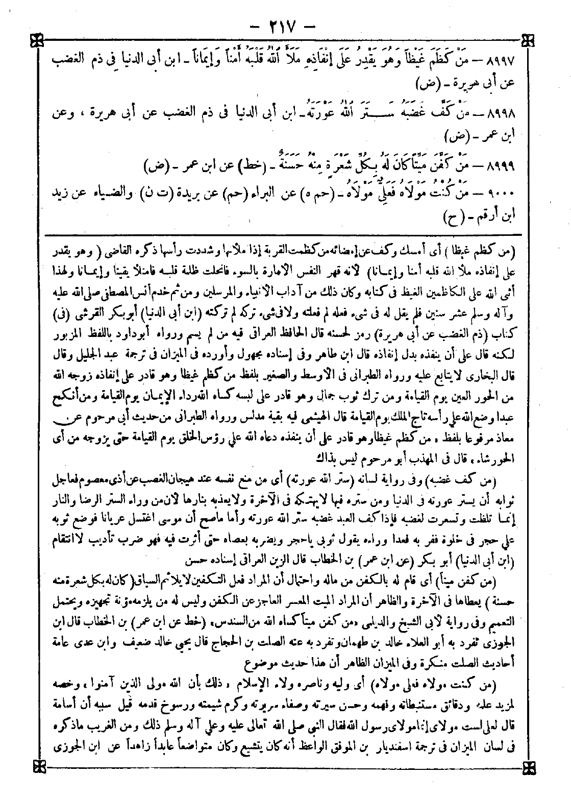 -[217]- 8997 - (من كظم غيظا) أي أمسك وكف عن إمضائه من كظمت القربة إذا ملأنها وشددت رأسها ذكره القاضي (وهو يقدر على إنفاذه ملأ الله قلبه أمنا وإيمانا) لأنه قهر النفس الأمارة بالسوء فانحلت ظلمة قلبه فامتلأ يقينا وإيمانا ولهذا أثنى الله على الكاظمين الغيظ في كتابه وكان ذلك من آداب الأنبياء والمرسلين ومن ثم خدم أنس المصطفى صلى الله عليه وآله وسلم عشر سنين فلم يقل له في شيء فعله لم فعلته ولا في شيء تركه لم تركته