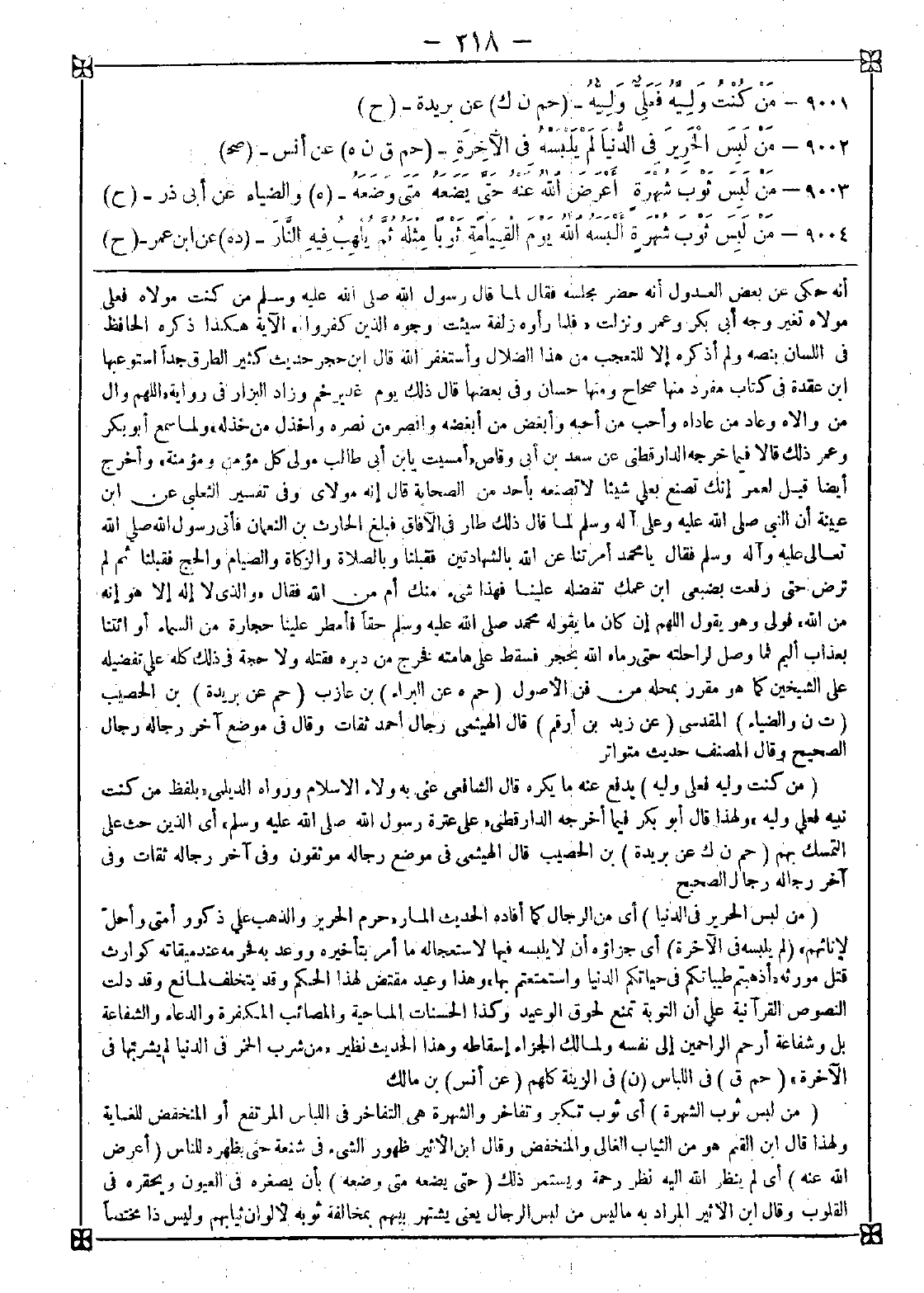 9003 - (من لبس ثوب الشهرة) أي ثوب تكبر وتفاخر والشهرة هي التفاخر في اللباس المرتفع أو المنخفض للغاية ولهذا قال ابن القيم: هو من الثياب الغالي والمنخفض وقال ابن الأثير: ظهور الشيء في شنعة حتى بظهره للناس (أعرض الله عنه) أي لم ينظر الله إليه نظر رحمة ويستمر ذلك (حتى يضعه متى وضعه) بأن يصغره في العيون ويحقره في القلوب وقال ابن الأثير: المراد به ما ليس من لبس الرجال يعني يشتهر بينهم بمخالفة ثوبه لألوان ثيابهم وليس ذا مختصا -[219]- بالثياب بل يحصل لمن لبس ما يخالف ملبوس الناس فيعجبوا من لباسه ويعتقدوه وقال القاضي: المراد بثوب الشهرة ما لا يحل لبسه وإلا لما رتب الوعيد عليه أو ما يقصد بلبسه التفاخر والتكبر على الفقراء والإدلال والتيه عليه وكسر قلوبهم أو ما يتخذه المساخر ليجعل به نفسه ضحكة بين الناس أو ما يرائي به من الأعمال فكنى بالثوب عن العمل وهو شائع والأظهر الأول لملاءمته لقوله ألبسه الله ثوب مذلة