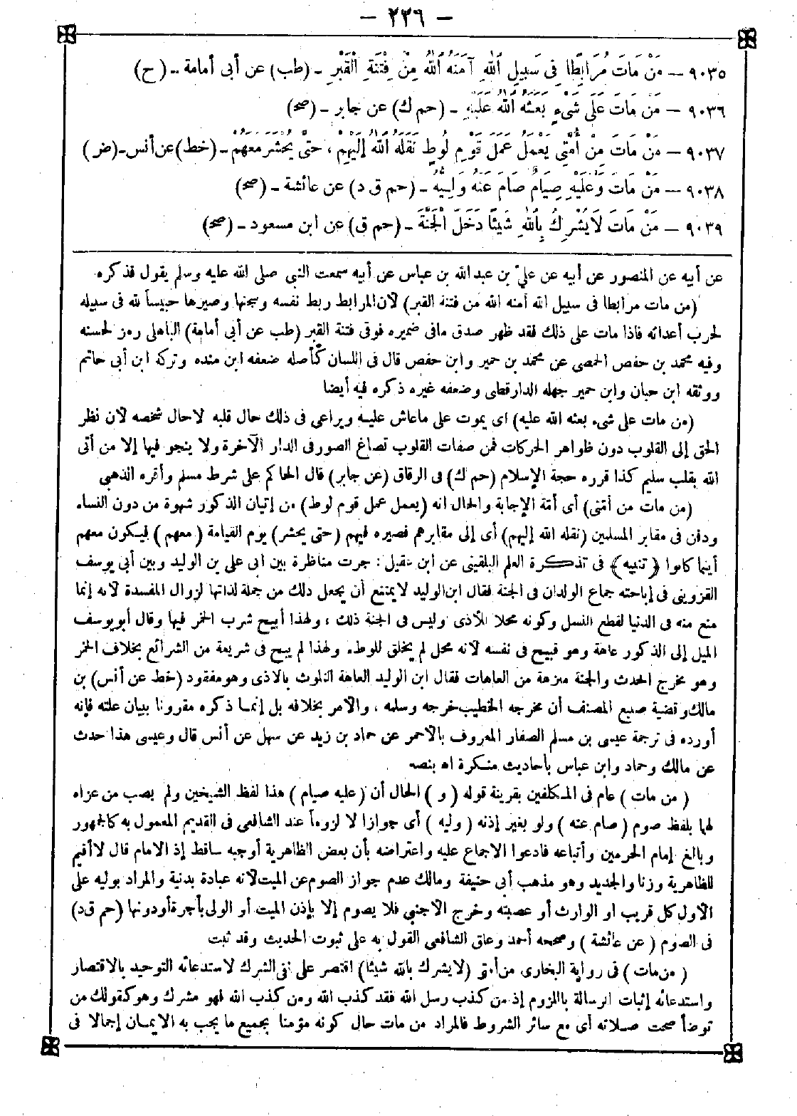 9035 - (من مات مرابطا في سبيل الله آمنه الله من فتنة القبر) لأن المرابط ربط نفسه وسجنها وصيرها حبيسا لله في سبيله لحرب أعدائه فإذا مات على ذلك فقد ظهر صدق ما في ضميره فوقي فتنة القبر