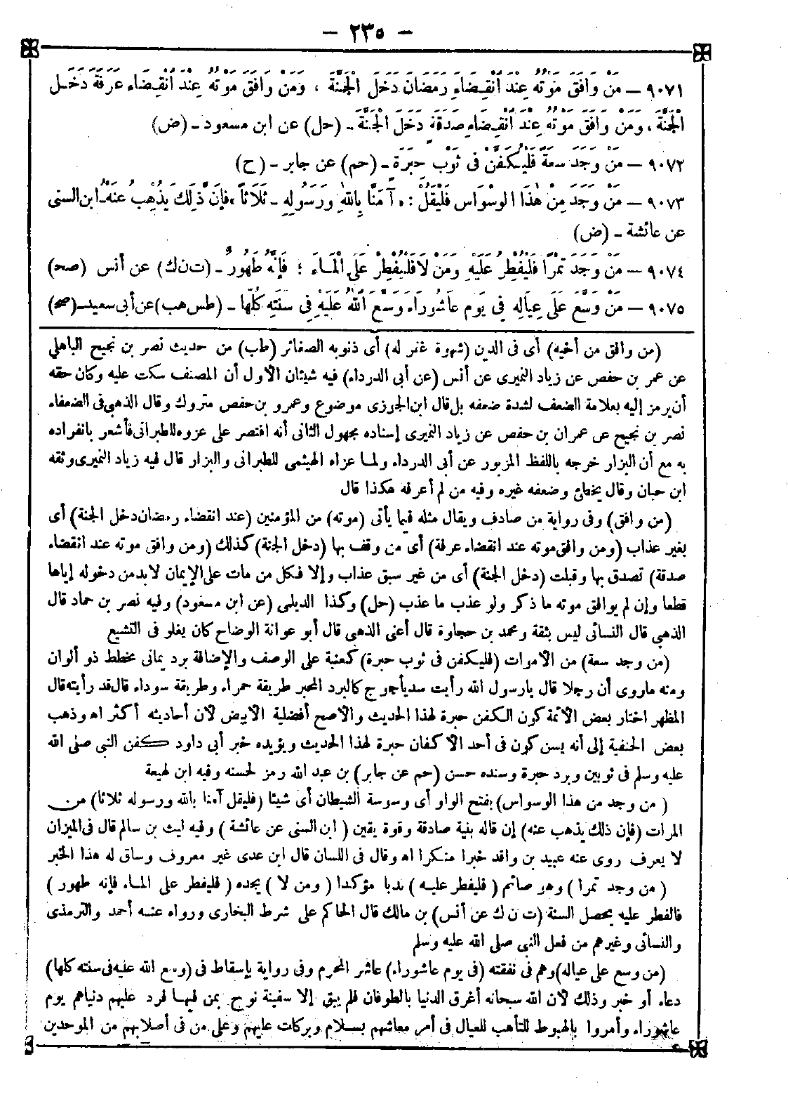 9072 - (من وجد سعة) من الأموات (فليكفن في ثوب حبرة) كعنبة على الوصف والإضافة برد يماني مخطط ذو ألوان ومنه ما روي أن رجلا قال: يا رسول الله رأيت سد يأجوج كالبرد المحبر طريقة حمراء وطريقة سوداء قال: قد رأيته قال المظهر: اختار بعض الأئمة كون الكفن حبرة لهذا الحديث والأصح أفضلية الأبيض لأن أحاديثه أكثر اه. وذهب بعض الحنفية إلى أنه يسن كون في أحد الأكفان حبرة لهذا الحديث ويؤيده خبر أبي داود كفن النبي صلى الله عليه وسلم في ثوبين وبرد حبرة وسنده حسن