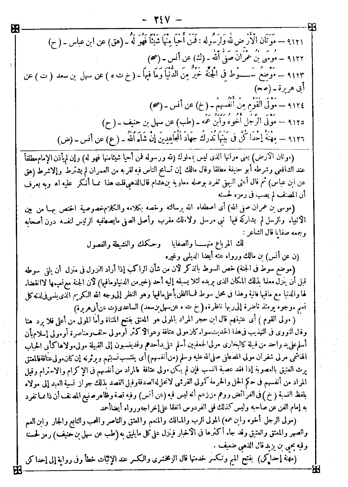 9125 - (مولى الرجل أخوه وابن عمه) المولى الرب والمالك والمنعم والمعتق والناصر والمحب والتابع والجار وابن العم والصهر والمعتق وقد جاء أكثرها في الأخبار فينزل على كل ما يليق به