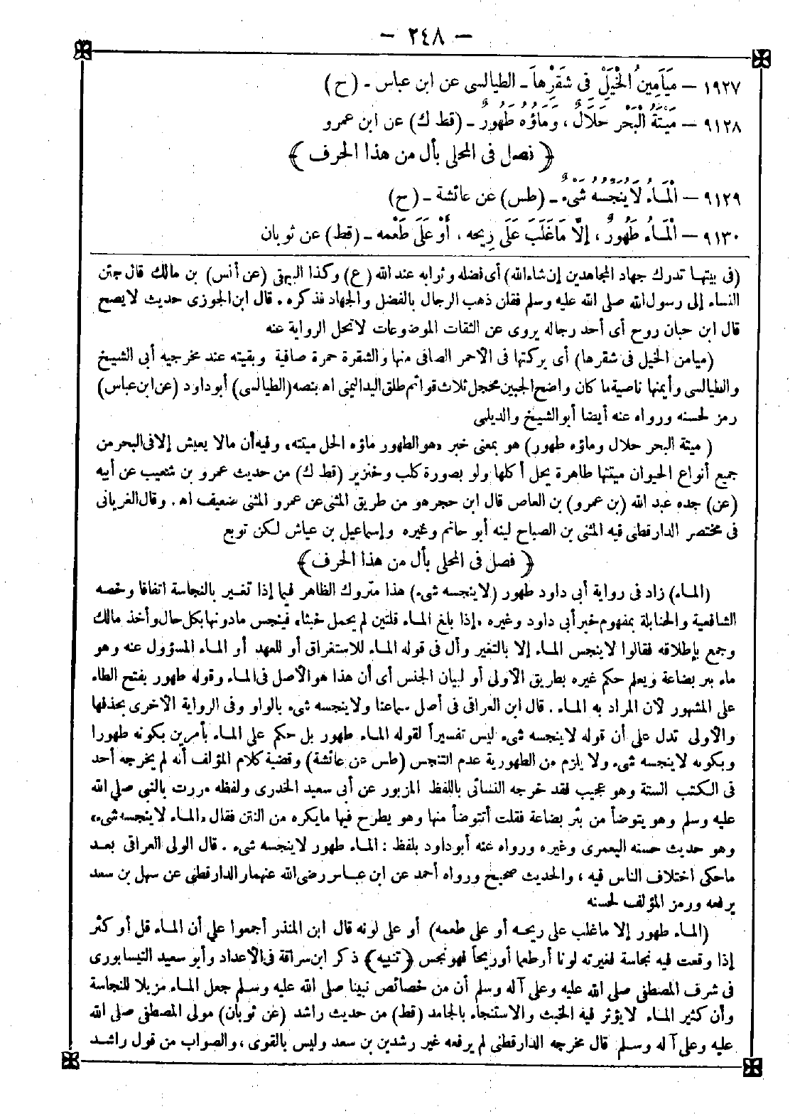 9130 - (الماء طهور إلا ما غلب على ريحه أو على طعمه) أو على لونه قال ابن المنذر: أجمعوا على أن الماء قل أو كثر إذا وقعت فيه نجاسة فغيرته لونا أو طعما أو ريحا فهو نجس