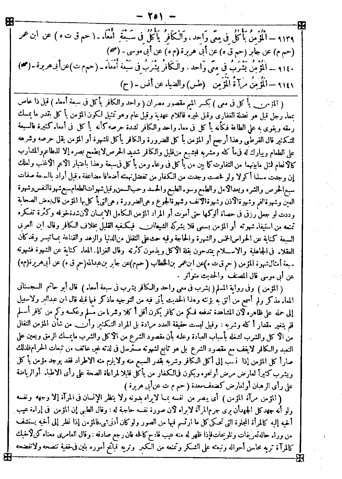 -[251]- 9139 - (المؤمن يأكل في معي) بكسر الميم مقصور مصران (واحد والكافر يأكل في سبعة أمعاء) قيل ذا خاص بمعاء رجل قيل هو نضلة الغفاري وقيل غيره فاللام عهدية وقيل عام وهو تمثيل لكون المؤمن يأكل بقدر ما يمسك رمقه ويقوى به على الطاعة فكأنه يأكل في معاء واحد والكافر لشدة حرصه كأنه يأكل في أمعاء كثيرة فالسبعة للتكثير قال القرطبي: وهذا أرجح أو المؤمن يأكل للضرورة والكافر يأكل للشهوة أو المؤمن يقل حرصه وشرهه على الطعام ويبارك له في مأكله ومشربه فيشبع من قليل والكافر شديد الحرص لا يطمح بصره إلا للمطاعم والمشارب كالأنعام فمثل ما بينهما من التفاوت كما بين من يأكل في وعاء ومن يأكل في سبعة وهذا باعتبار الأعم الأغلب ولعلك إن وجدت مسلما أكولا ولو فحصت وجدت من الكفار من تفضل نهمته أضعافا مضاعفة وقيل أراد بالسبعة صفات سبع الحرص والشره وبعد الأمل والطمع وسوء الطبع والحسد وحب السمن وقيل شهوات الطعام سبع شهوة النفس وشهوة العين وشهوة الفم وشهوة الأذن وشهوة الأنف وشهوة الجوع وهي الضرورة وهي التي يأكل بها المؤمن قال بعض الصحابة: وددت لو جعل رزقي في حصاة ألوكها حتى أموت أو المراد المؤمن الكامل الإيمان لأن شدة خوفه وكثرة تفكره تمنعه من استيفاء شهوته أو المؤمن يسمى فلا يشركه الشيطان فيكفيه القليل بخلاف الكافر وقال ابن العربي: السبعة كناية عن الحواس الخمس والشهوة والحاجة وفيه حث على التقلل من الدنيا والزهد والقناعة بما تيسر وقد كان العقلاء في الجاهلية والإسلام يمتدحون بقلة الأكل ويذمون كثرته وقال الغزالي: المعاء كناية عن الشهوة فشهوته سبعة أمثال شهوة المؤمن