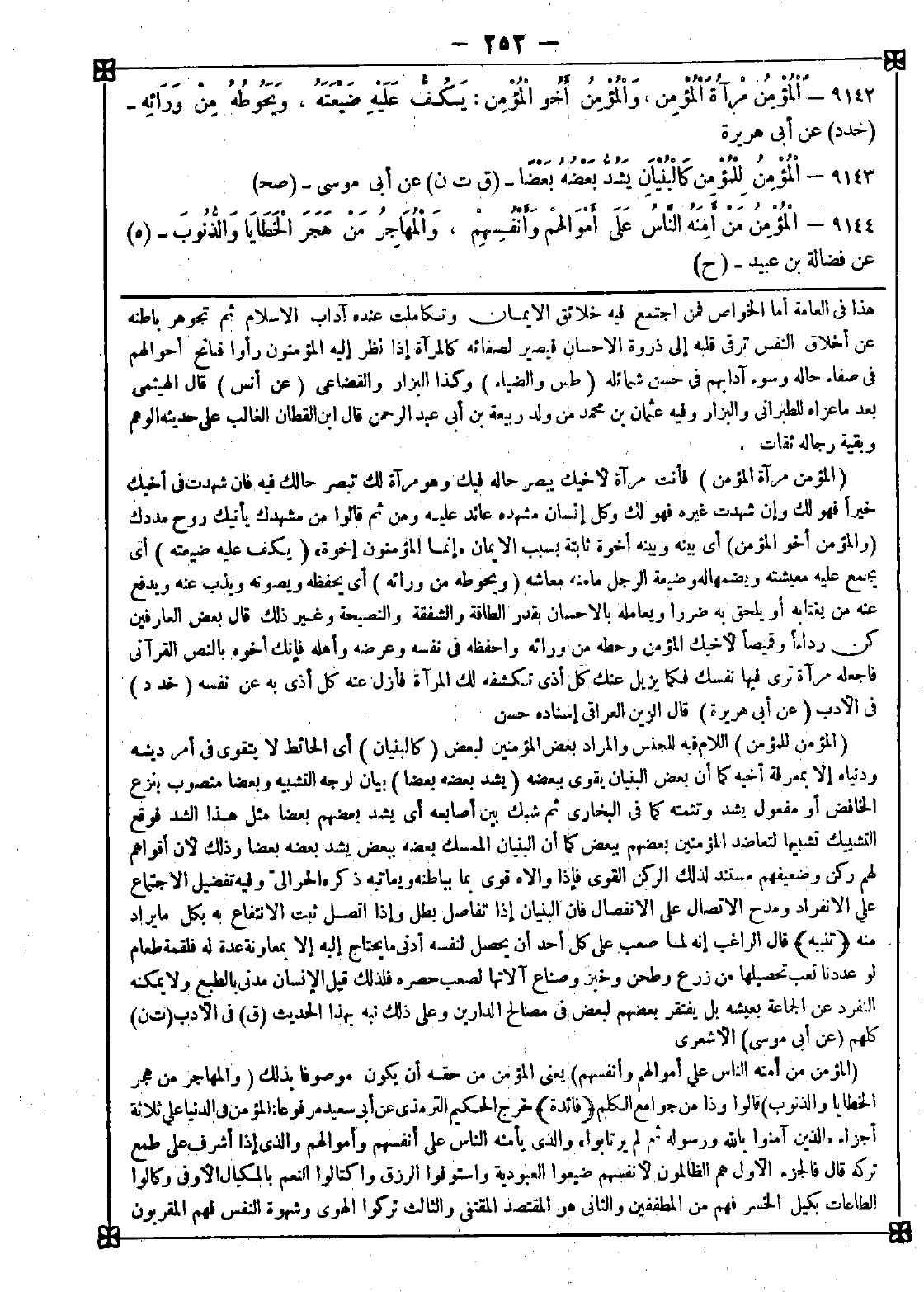 9144 - (المؤمن من أمنه الناس على أموالهم وأنفسهم) يعني المؤمن من حقه أن يكون موصوفا بذلك (والمهاجر من هجر الخطايا والذنوب) قالوا: وذا من جوامع الكلم <فائدة> خرج الحكيم الترمذي عن أبي سعيد مرفوعا: المؤمن في الدنيا على ثلاثة أجزاء {الذين آمنوا بالله ورسوله لم يرتابوا} والذي يأمنه الناس على أنفسهم وأموالهم والذي إذا أشرف على طمع تركه قال: فالجزء الأول هم الظالمون لأنفسهم ضيعوا العبودية واستوفوا الرزق واكتالوا النعم بالمكيال الأوفى وكالوا الطاعات بكيل الخسر فهم من المطففين والثاني هو المقتصد المقتفي والثالث تركوا الهوى وشهوة النفس فهم المقربون. -[253]-