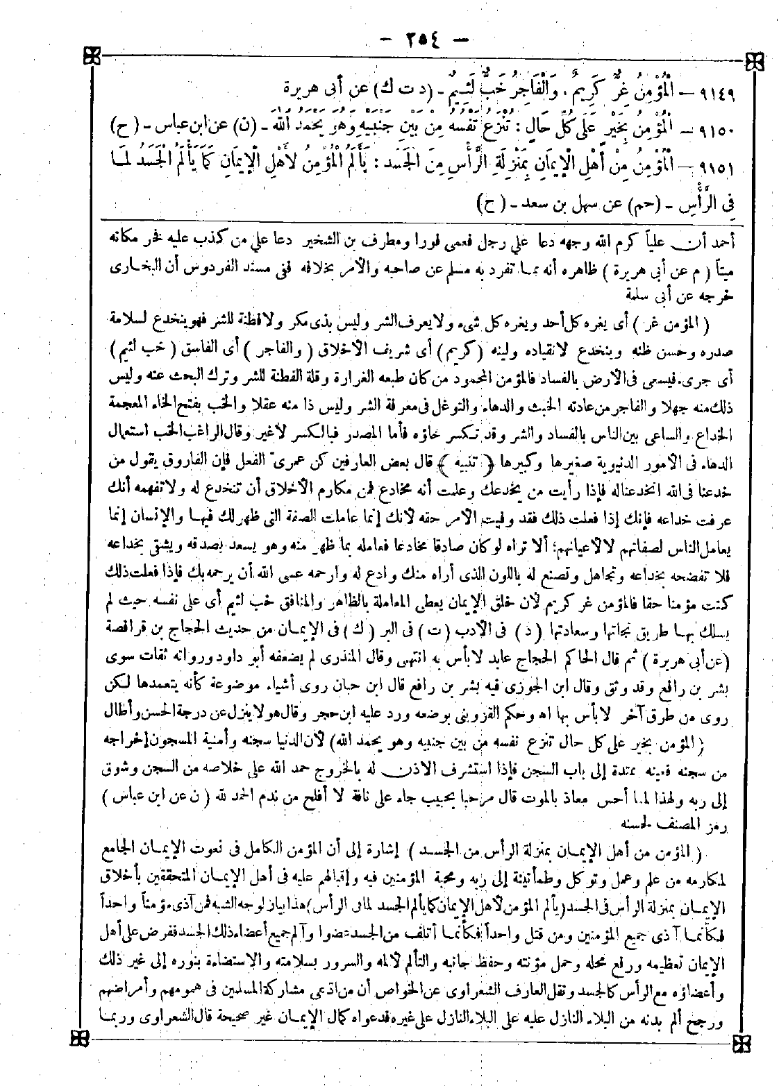 9149 - (المؤمن غر) أي يغره كل أحد ويغره كل شيء ولا يعرف الشر وليس بذي مكر ولا فطنة للشر فهو ينخذع لسلامة صدره وحسن ظنه وينخدع لانقياده ولينه (كريم) أي شريف الأخلاق (والفاجر) أي الفاسق (خب لئيم) أي جريء فيسعى في الأرض بالفساد فالمؤمن المحمود من كان طبعه الغرارة وقلة الفطنة للشر وترك البحث عنه وليس ذلك منه جهلا والفاجر من عادته الخبث والدهاء والتوغل في معرفة الشر وليس ذا منه عقلا والخب بفتح الخاء المعجمة الخداع والساعي بين الناس بالفساد والشر وقد تكسر خاؤه فأما المصدر فبالكسر لا غير وقال الراغب: الخب استعمال الدهاء في الأمور الدنيوية صغيرها وكبيرها