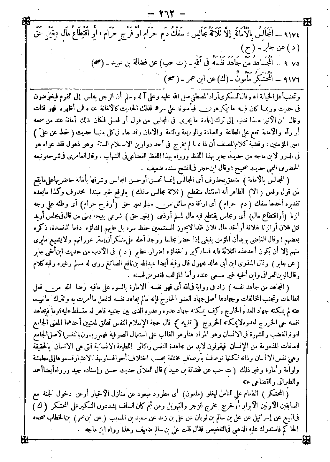 9174 - (المجالس بالأمانة) متعلق بمحذوف أي المجالس إنما تحسن أو حسن المجالس وشرفها بأمانة حاضريها على ما يقع من قول وفعل (إلا) الظاهر أنه استثناء منقطع (ثلاثة مجالس سفك) بالرفع خبر مبتدأ محذوف وكذا ما بعده تقديره أحدها سفك (دم حرام) أي إراقة دم سائل من مسلم بغير حق (أو فرج حرام) أي وطئه على وجه الزنا (أو اقتطاع مال) أي ومجلس يقتطع فيه مال لمسلم أو ذمي (بغير حق) شرعي يبيحه يعني من قال في مجلس أريد قتل فلان أو الزنا بفلانة أو أخذ مال فلان ظلما لا يجوز للمستمعين حفظ سره بل عليهم إفشاؤه دفعا للمفسدة ذكره بعضهم وقال القاضي: يريد أن المؤمن ينبغي إذا حضر مجلسا ووجد أهله على منكر أن يستر عوراتهم ولا يشيع ما يرى منهم إلا أن يكون أحد هذه الثلاثة فله فساد كبيرة واخفاؤه إضرار عظيم