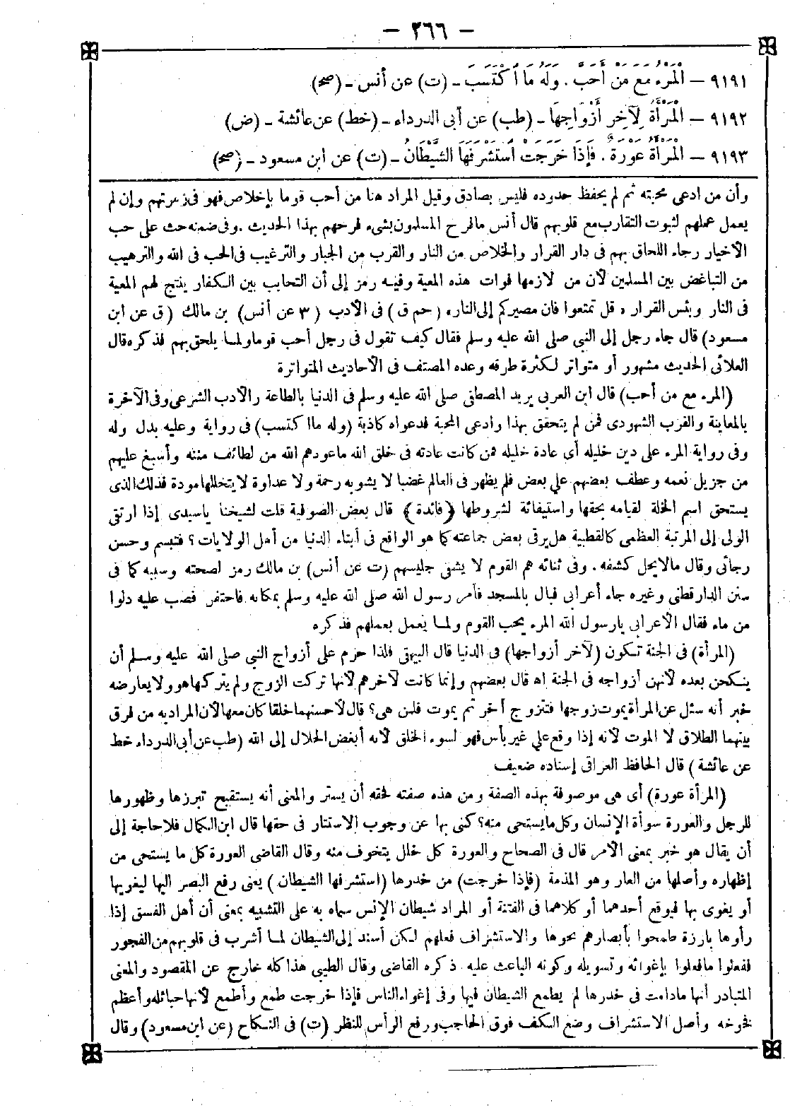9193 - (المرأة عورة) أي هي موصوفة بهذه الصفة ومن هذه صفته فحقه أن يستر والمعنى أنه يستقبح تبرزها وظهورها للرجل والعورة سوأة الإنسان وكل ما يستحي منه؟ كنى بها عن وجوب الاستتار في حقها قال ابن الكمال: فلا حاجة إلى أن يقال هو خبر بمعنى الأمر قال في الصحاح: والعورة كل خلل يتخوف منه وقال القاضي: العورة كل ما يستحى من إظهاره وأصلها من العار وهو المذمة (فإذا خرجت) من خدرها (استشرفها الشيطان) يعني رفع البصر إليها ليغويها أو يغوي بها فيوقع أحدهما أو كلاهما في الفتنة أو المراد شيطان الإنس سماه به على التشبيه بمعنى أن أهل الفسق إذا رأوها بارزة طمحوا بأبصارهم نحوها والاستشراف فعلهم لكن أسند إلى الشيطان لما أشرب في قلوبهم من الفجور ففعلوا ما فعلوا بإغوائه وتسويله وكونه الباعث عليه ذكره القاضي وقال الطيبي: هذا كله خارج عن المقصود والمعنى المتبادر أنها ما دامت في خدرها لم يطمع الشيطان فيها وفي إغواء الناس فإذا خرجت طمع وأطمع لأنها حبائله وأعظم فخوخه وأصل الاستشراف وضع الكف فوق الحاجب ورفع الرأس للنظر