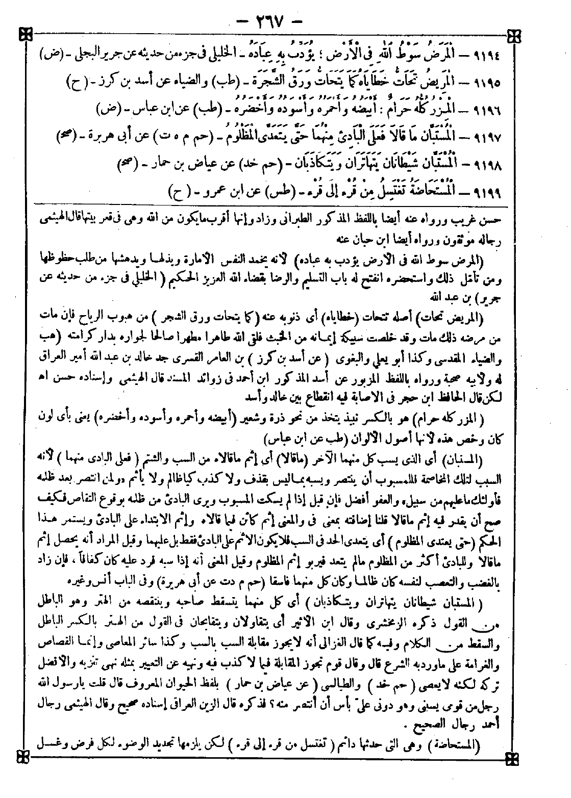 9198 - (المستبان شيطانان يتهاتران ويتكاذبان) أي كل منهما يتسقط صاحبه وينتقصه من الهتر وهو الباطل من القول ذكره الزمخشري. وقال ابن الأثير: أي يتقاولان ويتقابحان في القول من الهتر بالكسر الباطل والسقط من الكلام وفيه كما قال الغزالي: أنه لا يجوز مقابلة السب بالسب وكذا سائر المعاصي وإنما القصاص والغرامة على ما ورد به الشرع قال: وقال قوم تجوز المقابلة فيما لا كذب فيه ونهيه عن التعيير بمثله نهي تنزيه والأفضل تركه لكنه لا يعصى
