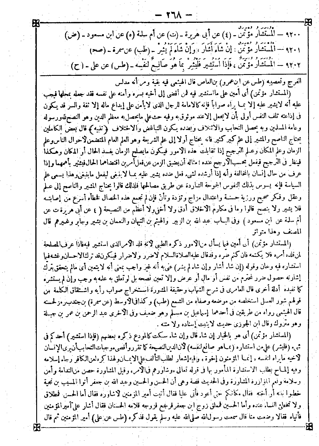 9201 - (المستشار مؤتمن) أن أمين فيما يسأل من الأمور ذكره الطيبي لأنه قلد الأمر الذي استشير فيه فإذا عرف المصلحة لمن قلده أمره فلا يكتمه فإن كتم ضره وقد قال عليه الصلاة والسلام لا ضرر ولا ضرار فيكون قد ترك الإحسان وغشه فيما استشاره فيه وخان وقوله (إن شاء أشار وإن شاء لم يشر) عنى به أنه غير واجب بمعنى أنه لا يتعين أي ما لم يتحقق بترك إشارته حصول ضرر لمحترم من نفس أو مال أو عرض وإلا تعين نصحه بل لو تعلق به علمه به وجب وإن لم يستشره كما تفيده أدلة أخرى قال العامري في شرح الشهاب: وحقيقة المشورة استخراج صواب رأيه واشتقاق الكلمة من قولهم شور العسل استخلصه من موضعه وصفاه من الشمع