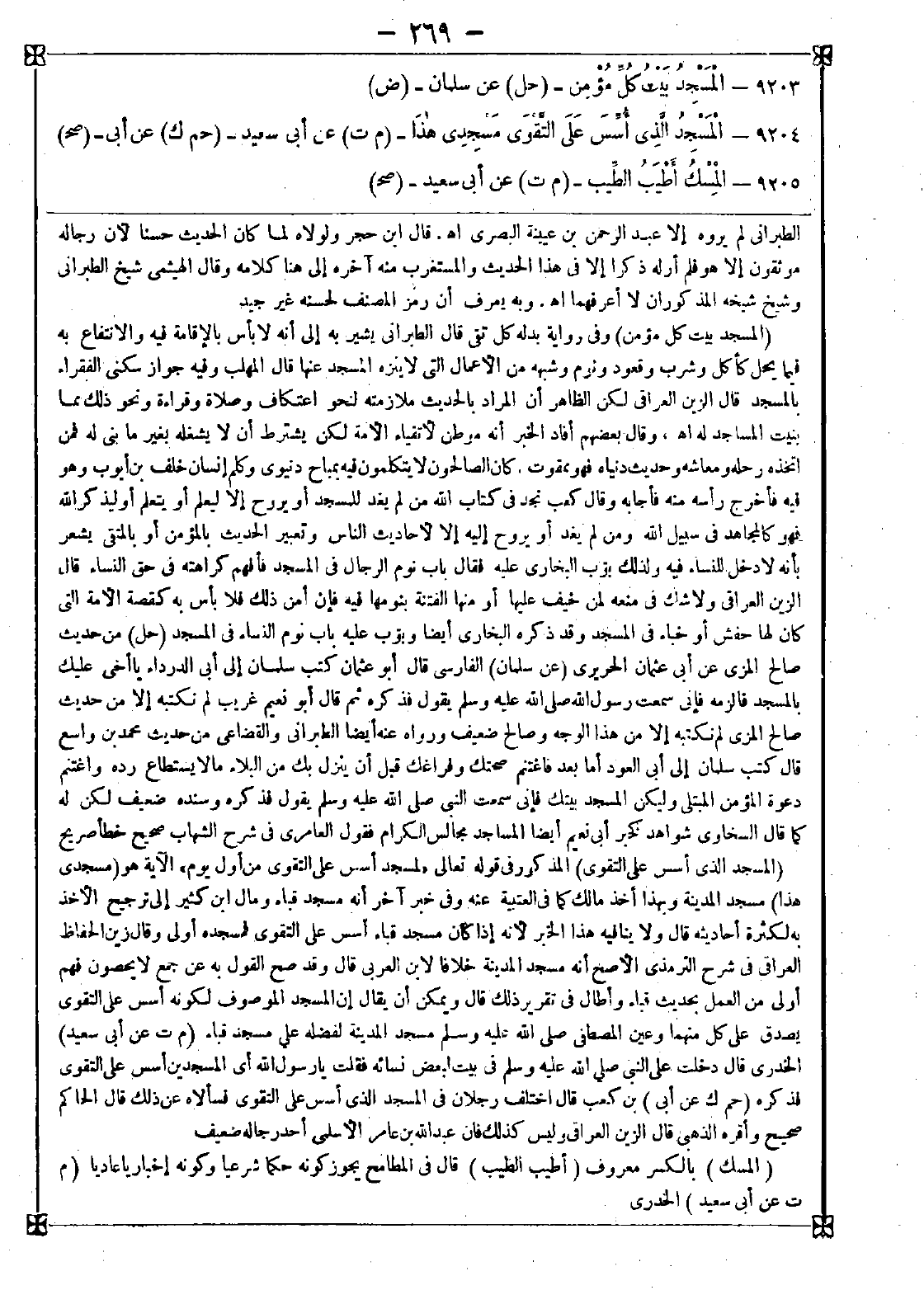 9204 - (المسجد الذي أسس على التقوى) المذكور في قوله تعالى {لمسجد أسس على التقوى من أول يوم} الآية هو (مسجدي هذا) مسجد المدينة وبهذا أخذ مالك كما في العتبية عنه وفي خبر آخر أنه مسجد قباء ومال ابن كثير إلى ترجيح الأخذ به لكثرة أحاديثه قال: ولا ينافيه هذا الخبر لأنه إذا كان مسجد قباء أسس على التقوى فمسجده أولى وقال زين الحفاظ العراقي في شرح الترمذي: الأصح أنه مسجد المدينة خلافا لابن العربي قال: وقد صح القول به عن جمع لا يحصون فهم أولى من العمل بحديث قباء وأطال في تقرير ذلك قال: ويمكن أن يقال إن المسجد الموصوف لكونه أسس على التقوى يصدق على كل منهما وعين المصطفى صلى الله عليه وسلم مسجد المدينة لفضله على مسجد قباء