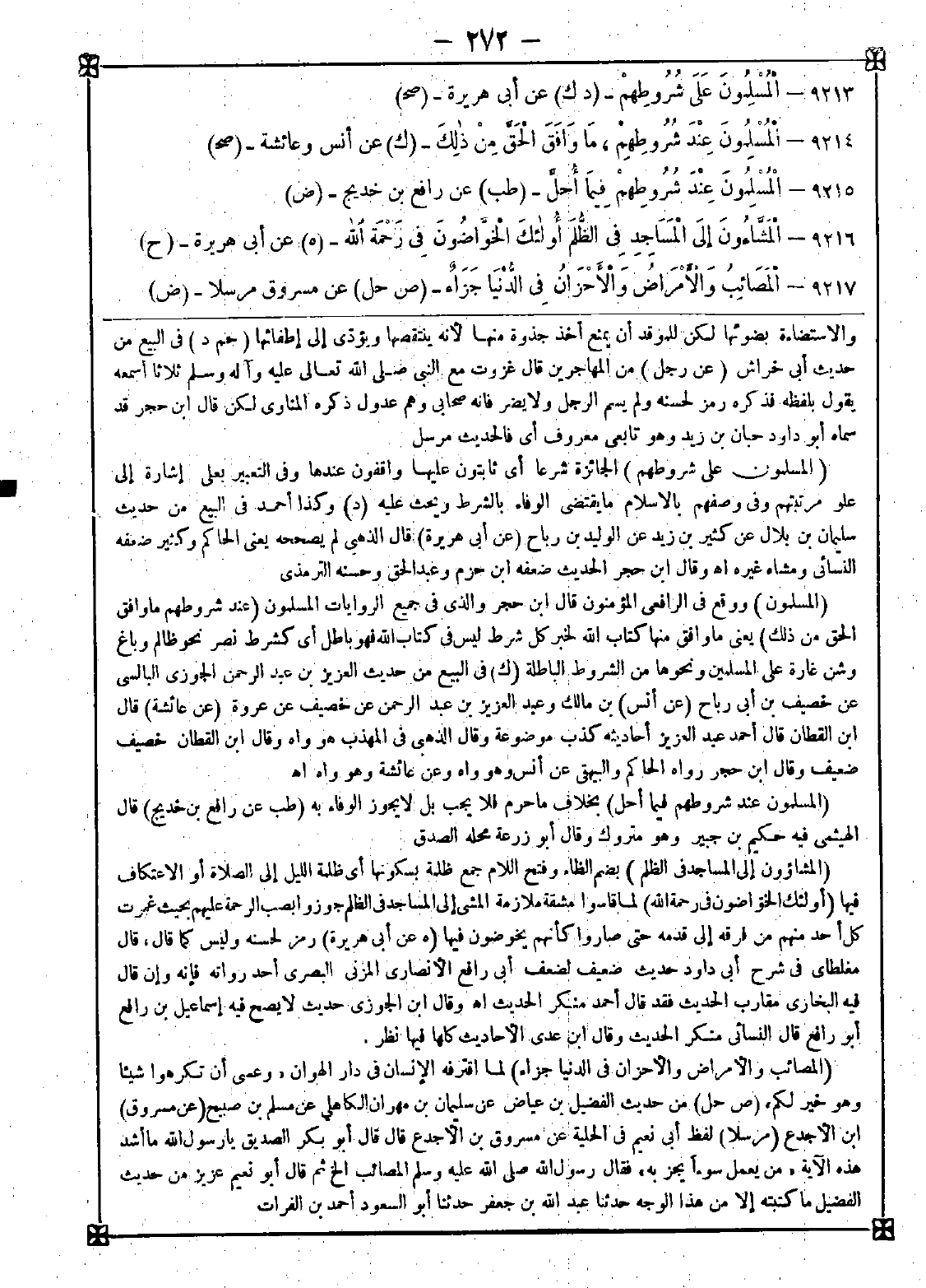 9213 - (المسلمون على شروطهم) الجائزة شرعا أي ثابتون عليها واقفون عندها وفي التعبير بعلى إشارة إلى علو مرتبتهم وفي وصفهم بالإسلام ما يقتضي الوفاء بالشرط ويحث عليه