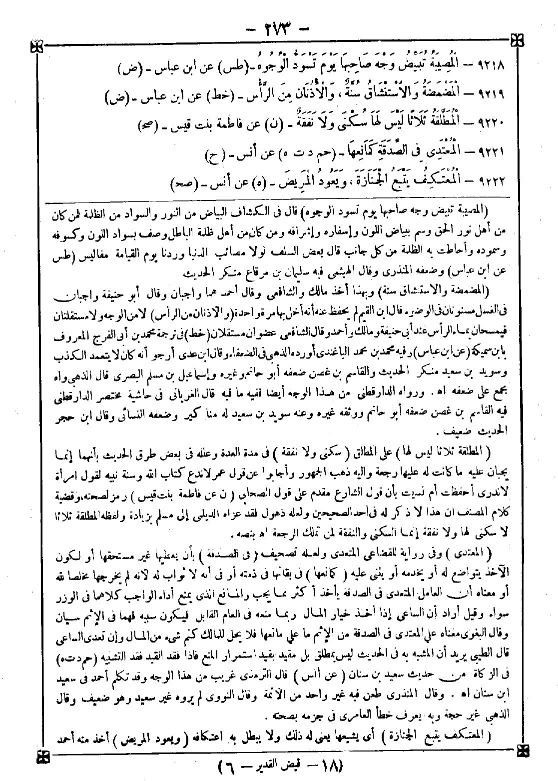 9222 - (المعتكف يتبع الجنازة) أي يشيعها يعني له ذلك ولا يبطل به اعتكافه (ويعود المريض) أخذ منه أحمد -[274]- والشافعي أن للمعتكف الخروج للقرب إذا اشترطه وقال مالك: لا يجوز اشتراط ذلك ثم إن ظاهر صنيع المصنف أن ذا هو الحديث بكماله والأمر بخلافه بل بقيته وإذا خرج لحاجة قنع رأسه حتى يرجع اه