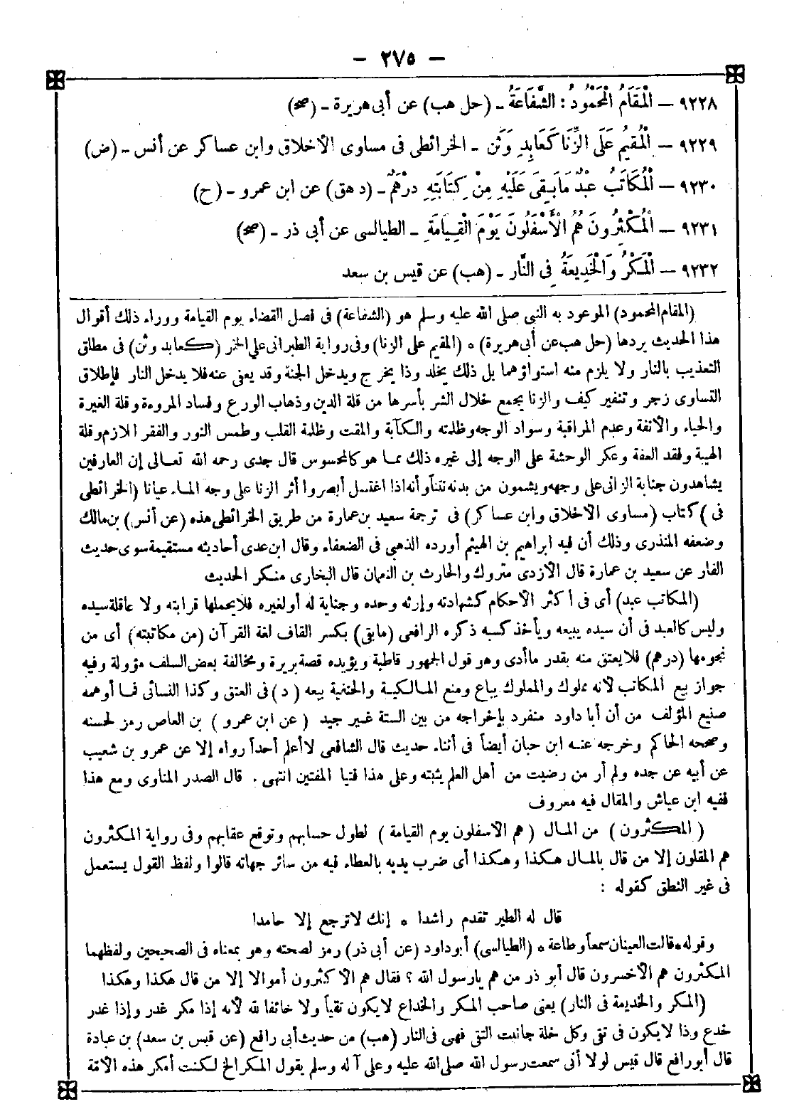9232 - (المكر والخديعة في النار) يعني صاحب المكر والخداع لا يكون تقيا ولا خائفا لله لأنه إذا مكر غدر وإذا غدر خدع وذا لا يكون في تقى وكل خلة جانبت التقى فهي في النار